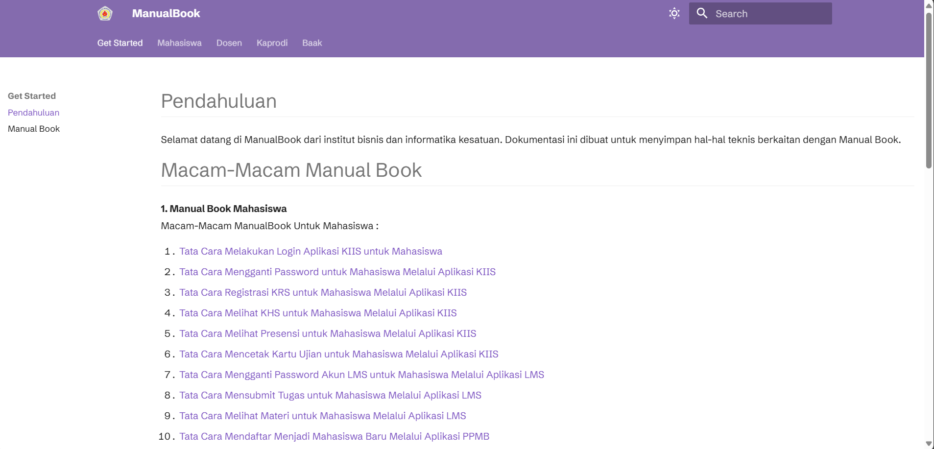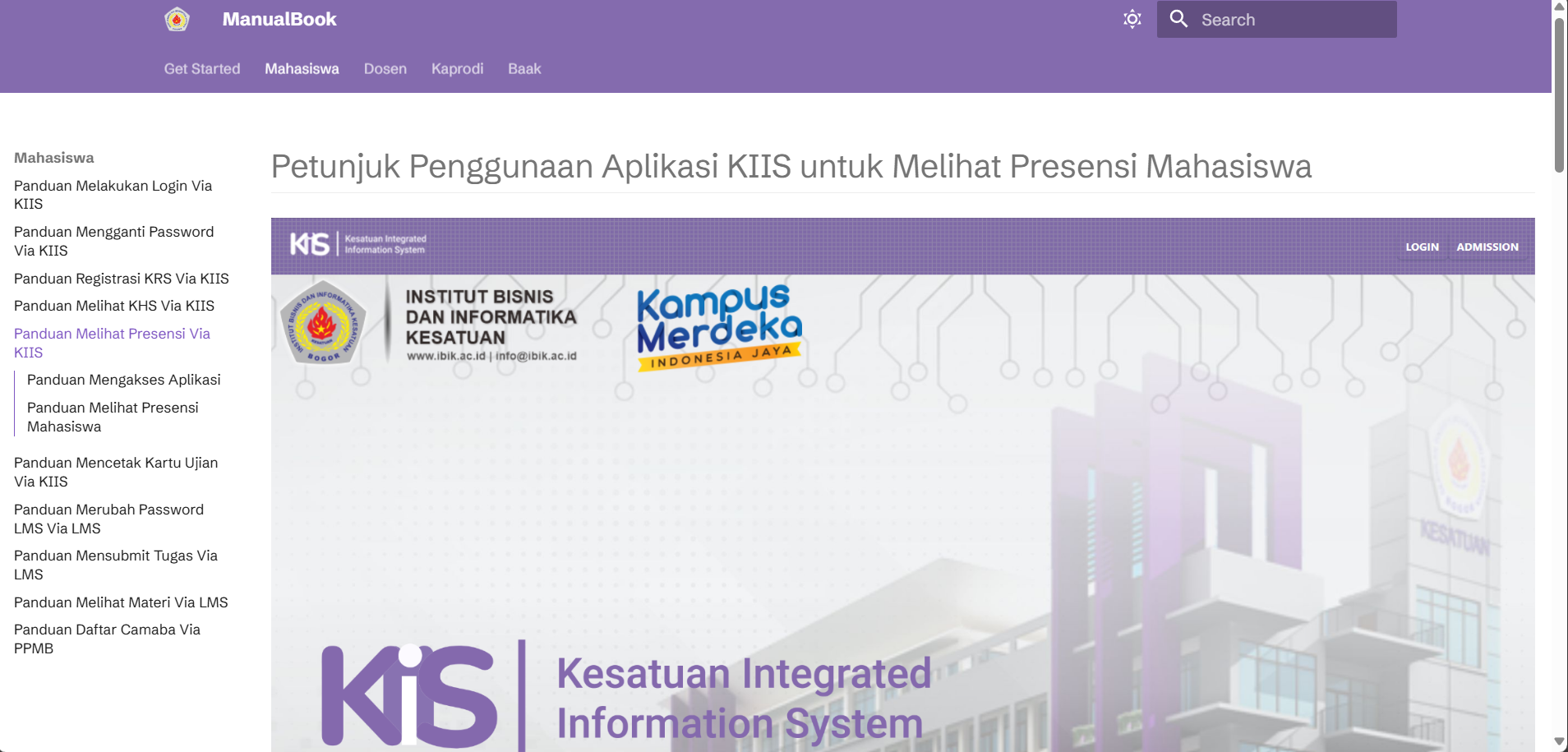 Manual Book dari institut bisnis dan informatika kesatuan. Dokumentasi ini dibuat untuk menyimpan hal-hal teknis berkaitan dengan Manual Book KIIS, PPMB, LMS, CDC, Dan LPPM. Manual Book ini dikembangakan oleh Tim Pengembang Teknologi Informasi, Institut Bisnis dan Informatika Kesatuan (IBIK). Berikut ini merupakan Tata Cara Menggunakan Website Manual Book.