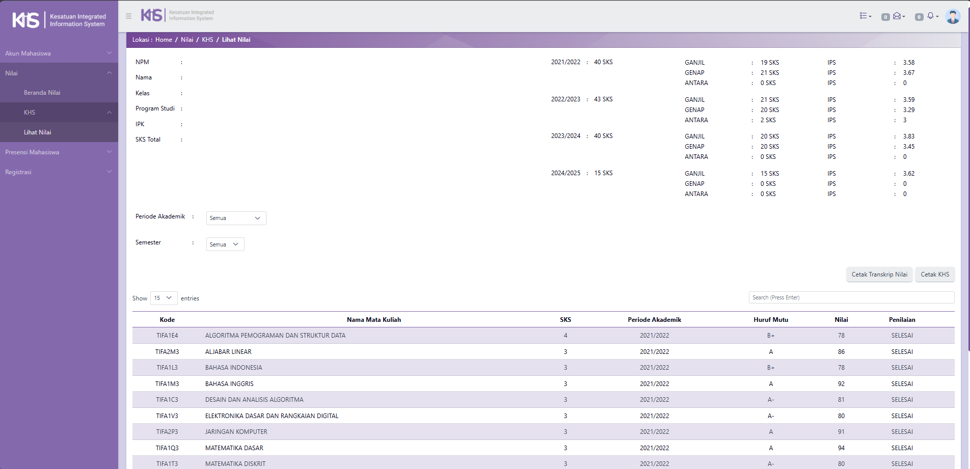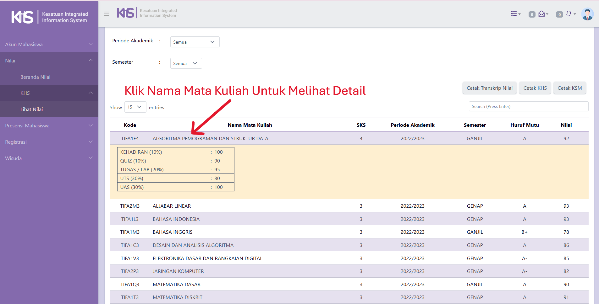 - Klik bagian nama mata kuliah untuk melihat detail nilai.