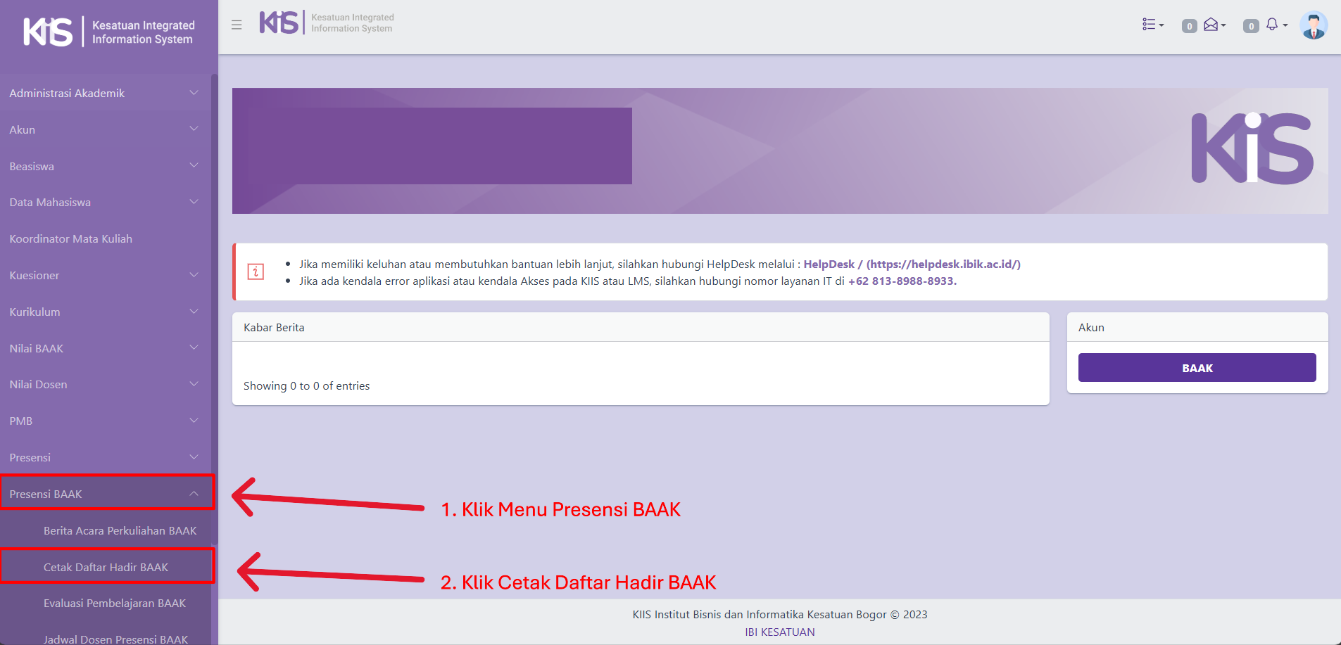 Pertama, BAAK Klik Menu Presensi BAAK, Setelahnya Klik Cetak Daftar Hadir BAAK.