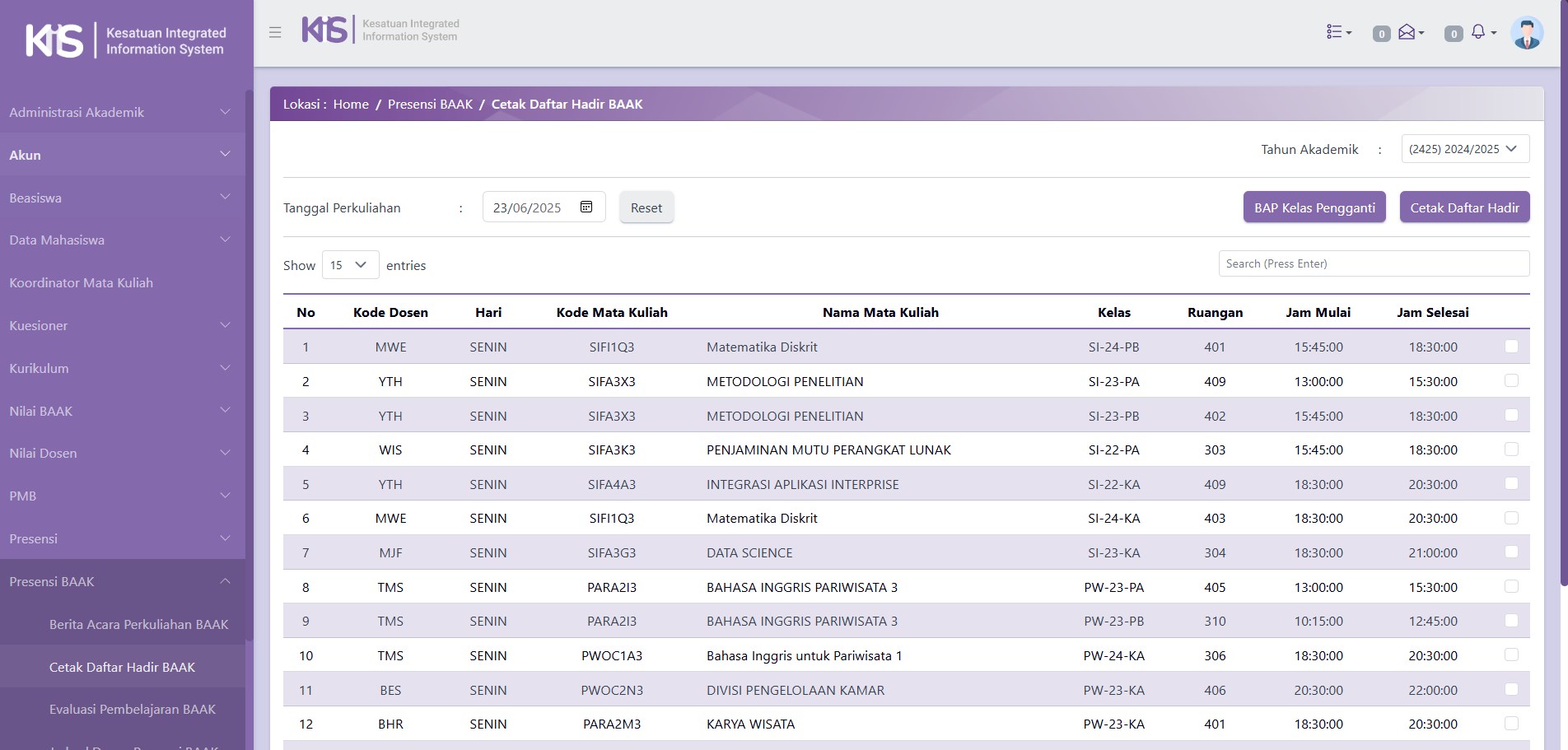 Tampilan setelah BAAK Klik Menu Cetak Daftar Hadir BAAK