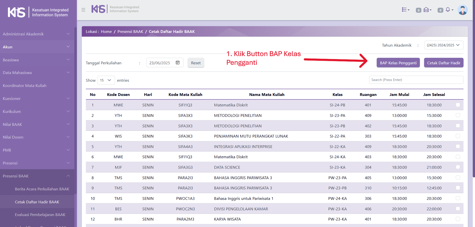 Setelah berhasil LOGIN di sistem KIIS, BAAK dapat langsung Mencetak BAP Kelas Pengganti pada Menu Presensi BAAK. Rincian tata cara Mencetak BAP Kelas Pengganti adalah sebagai berikut: