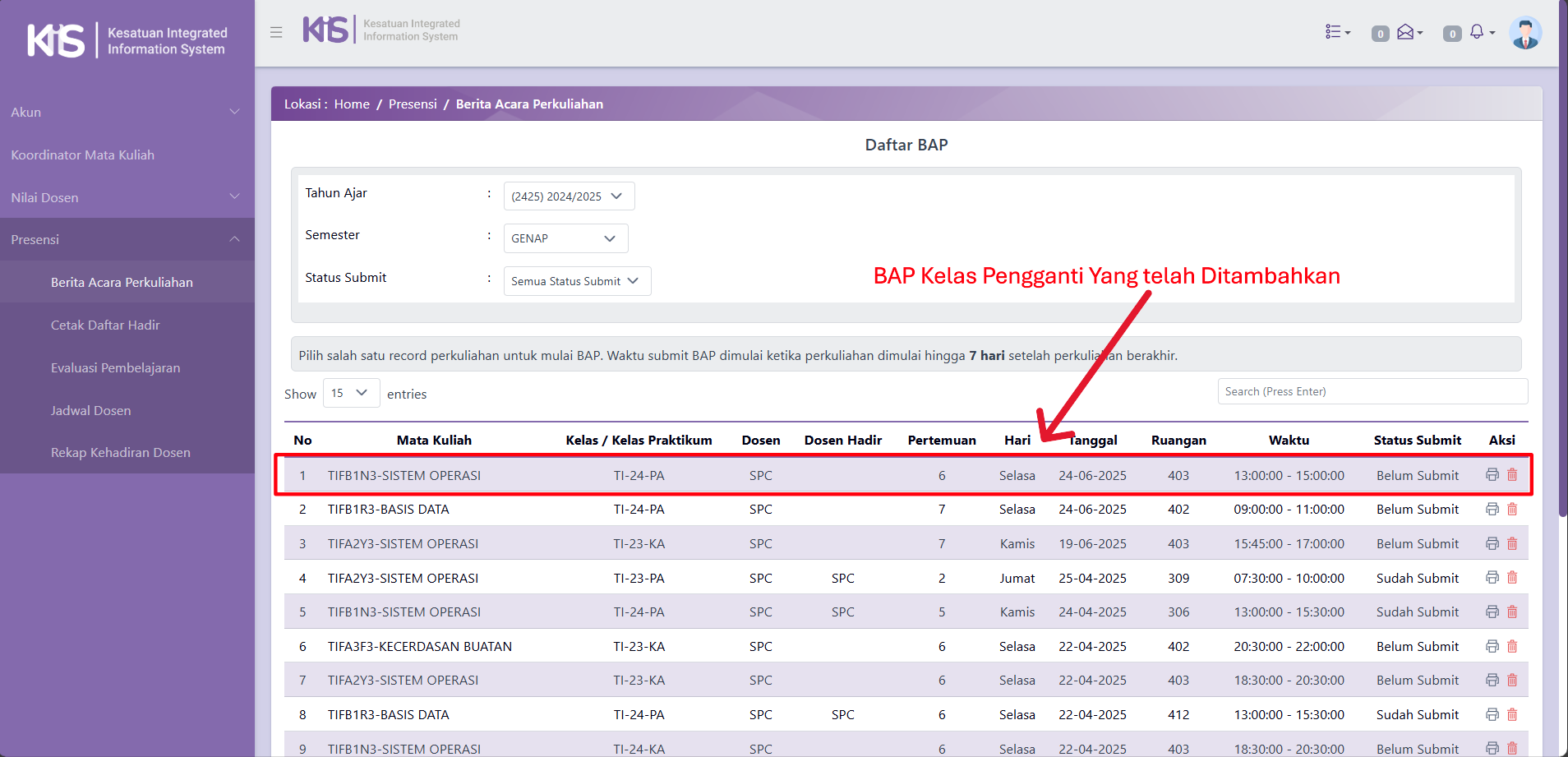 - Tampilan BAP Kelas Pengganti Yang Sudah Ditambahkan.