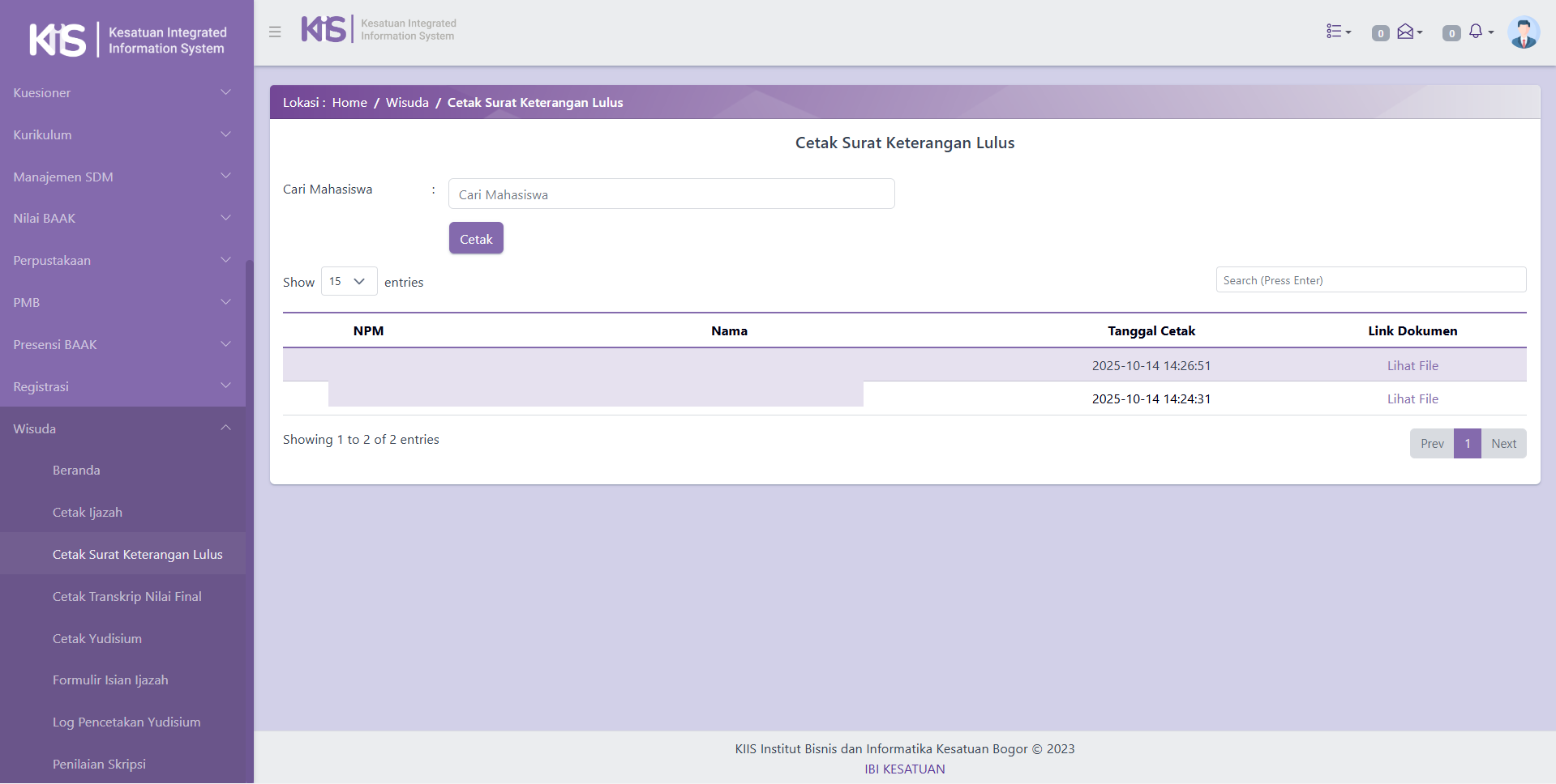 Tampilan BAAK Berhasil Cetak Surat Keterangan Lulus