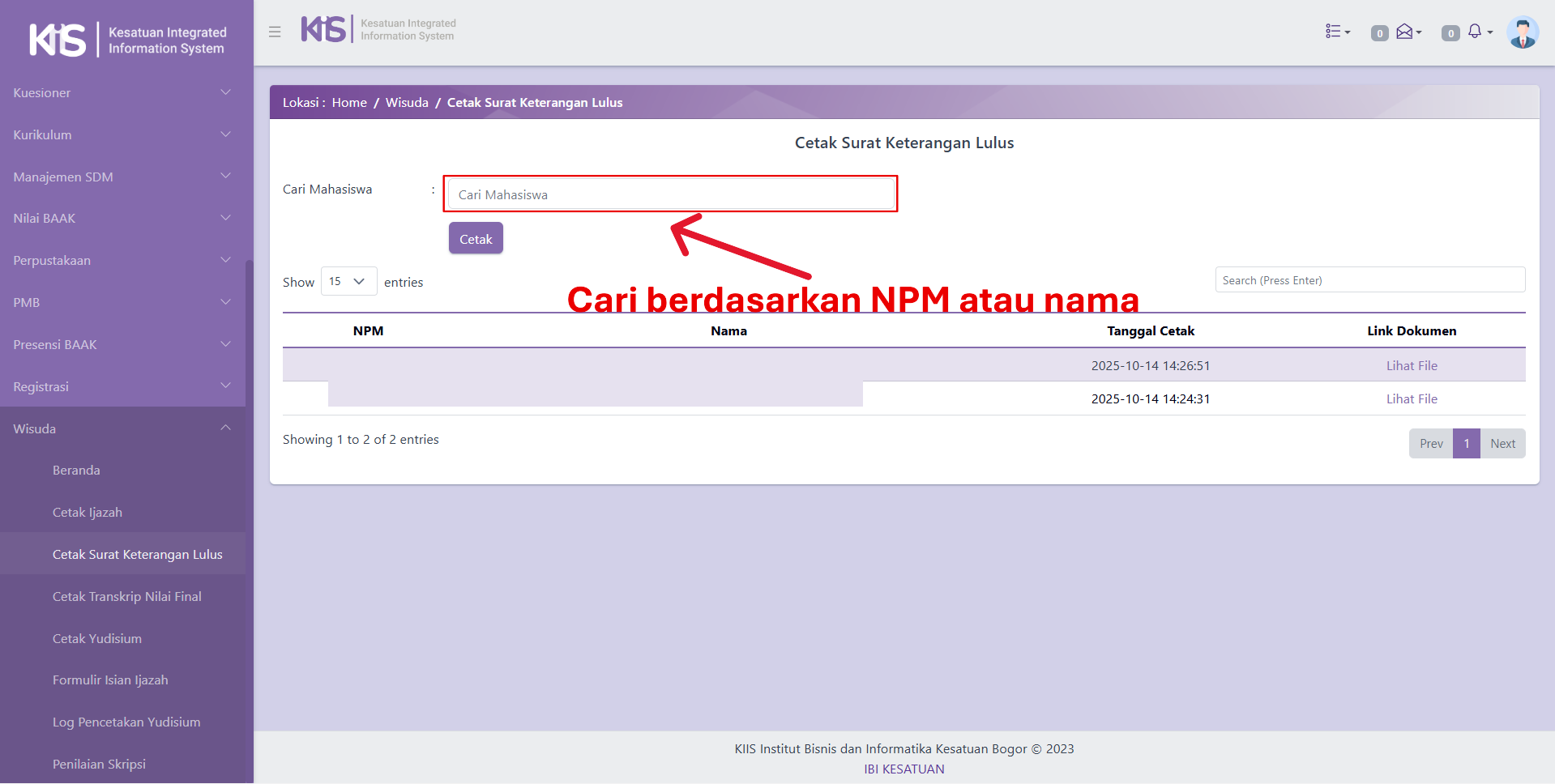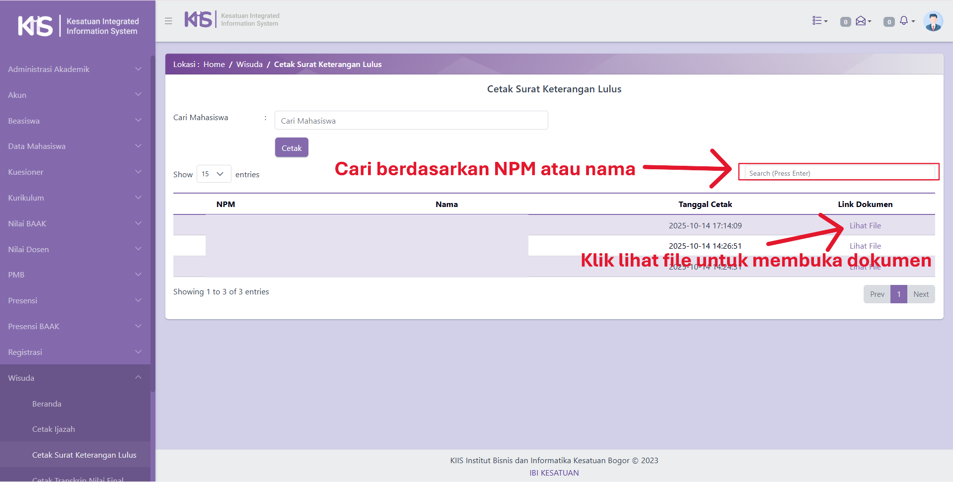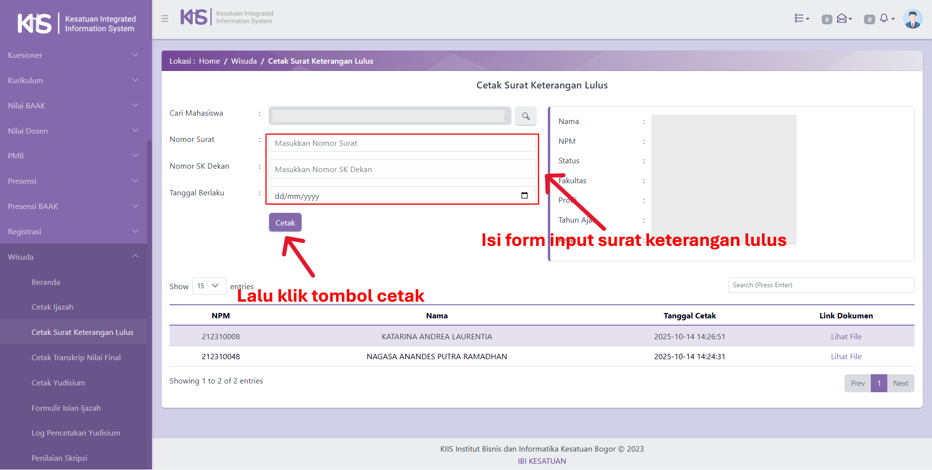 - Pertama, klik menu Wisuda lalu pilih submenu Cetak Surat Keterangan Lulus.