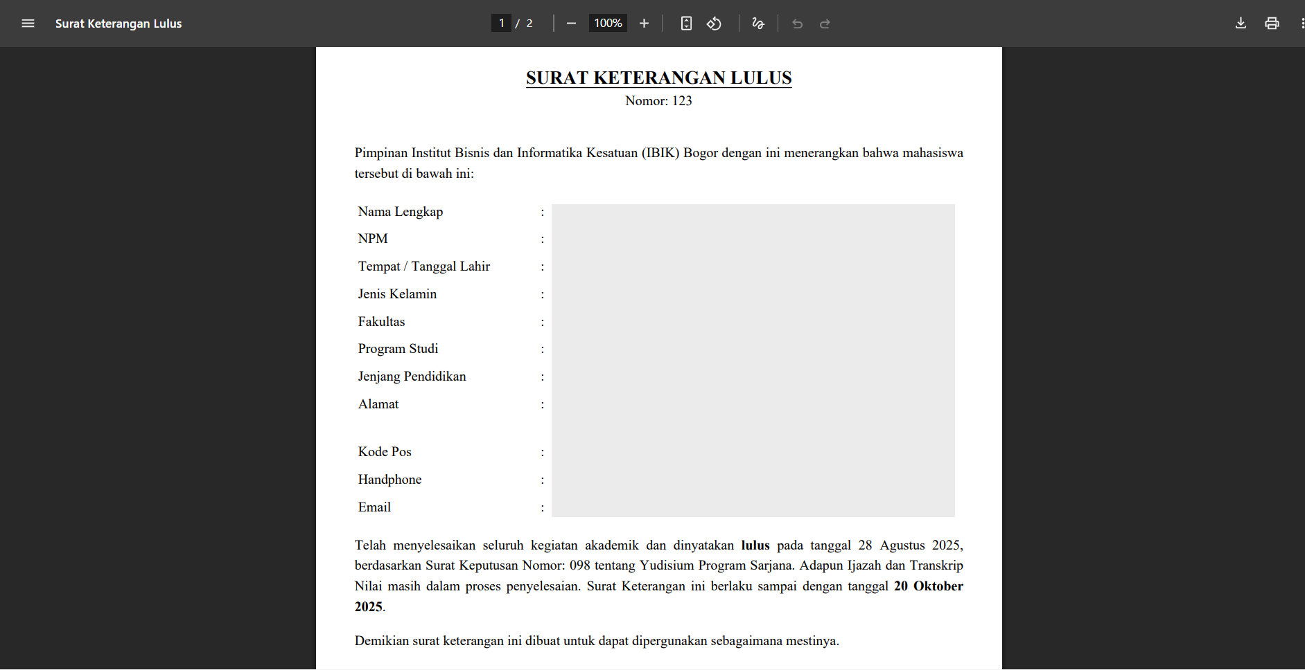 Tampilan Surat Keterangan Lulus yang sudah dicetak dan bisa diunduh.