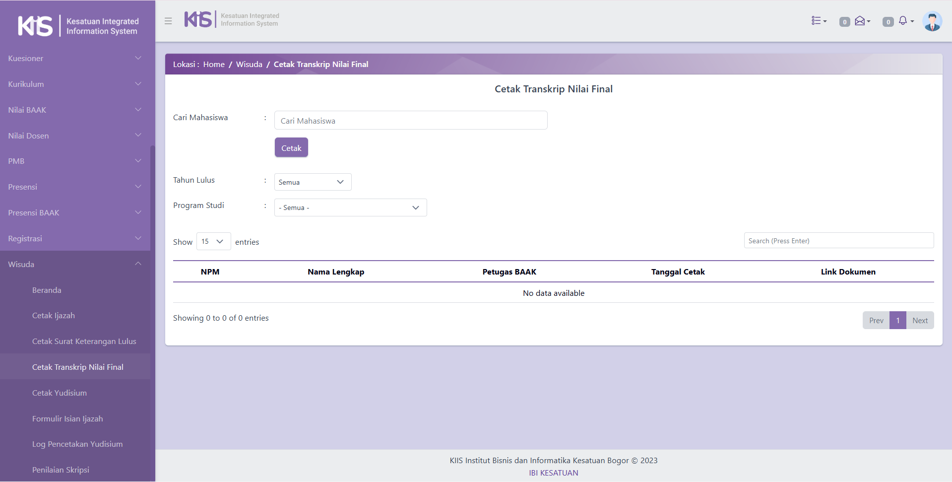 - Tampilan antarmuka (user interface) ketika berhasil klik menu Cetak Transkrip Nilai Final pada aplikasi KIIS.