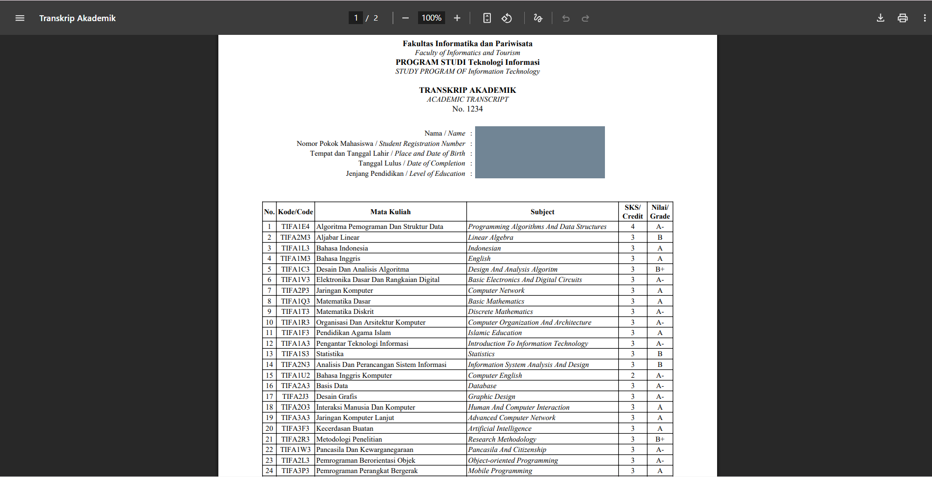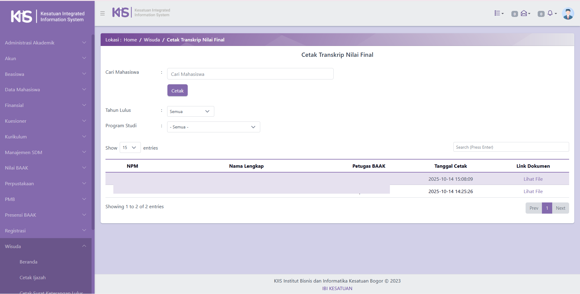 - Tampilan antarmuka (user interface) ketika berhasil Cetak Transkrip Nilai Final pada aplikasi KIIS.