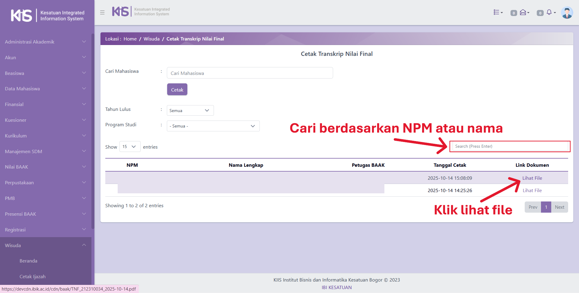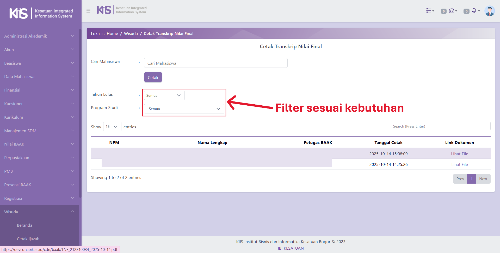 Tampilan Antarmuka Berhasil Klik Menu Cetak Transkrip Nilai Final