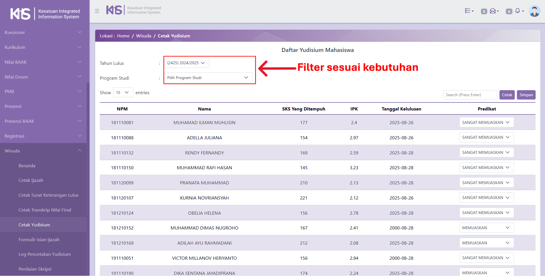 - Tampilan antarmuka (user interface) ketika berhasil klik menu Cetak Yudisium pada aplikasi KIIS adalah berisi Daftar Yudisium Mahasiswa yang akan dicetak oleh BAAK.