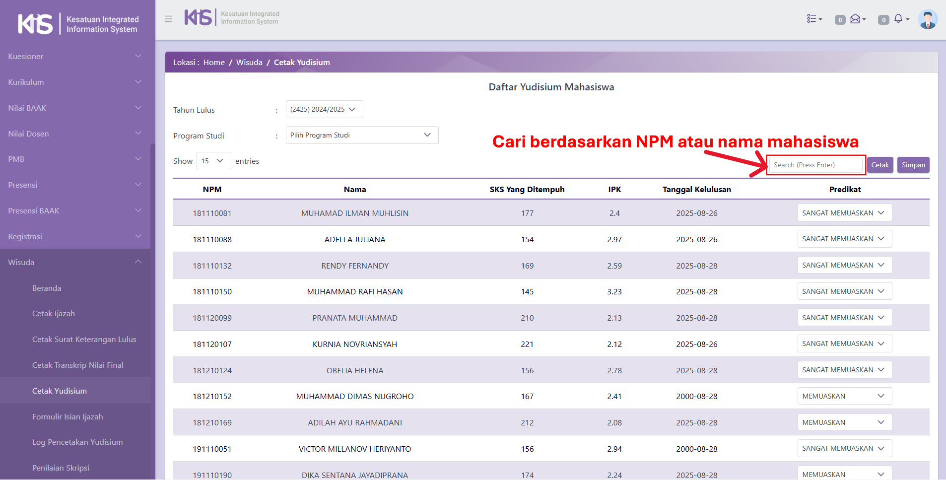 Gunakan search box atau scroll daftar tabel untuk menemukan nama atau NPM Mahasiswa yang akan dicetak.