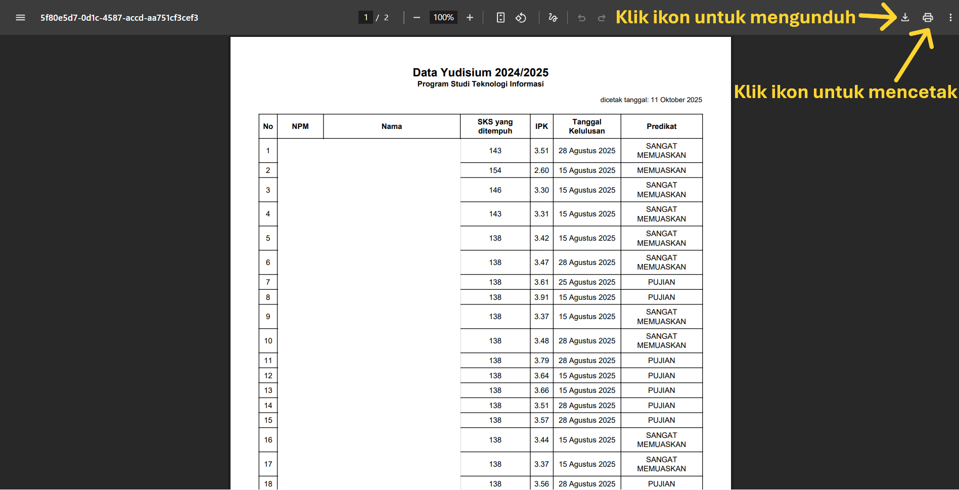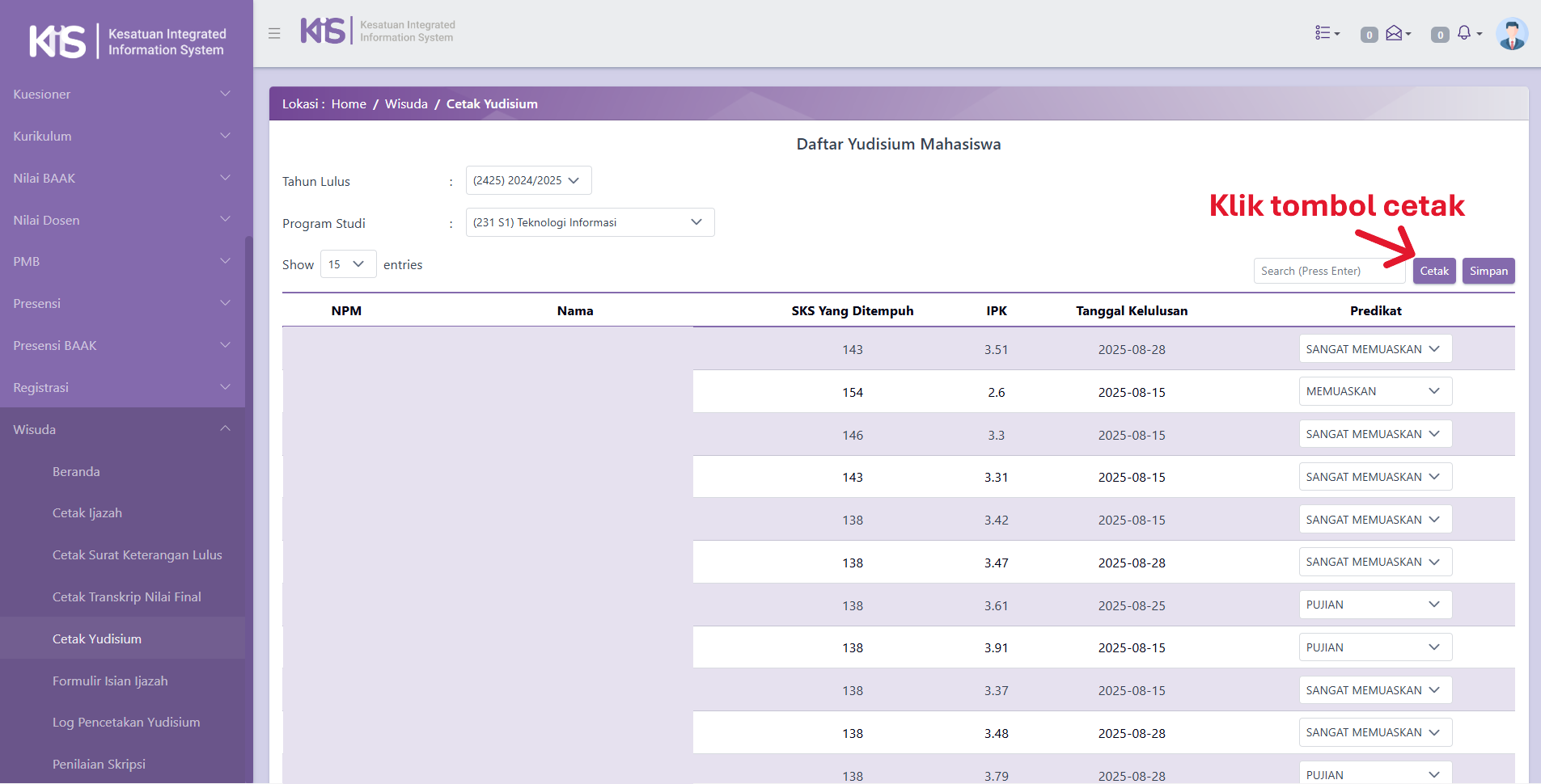 Setelah itu klik tombol Cetak untuk menghasilkan dokumen yudisium dalam format resmi.