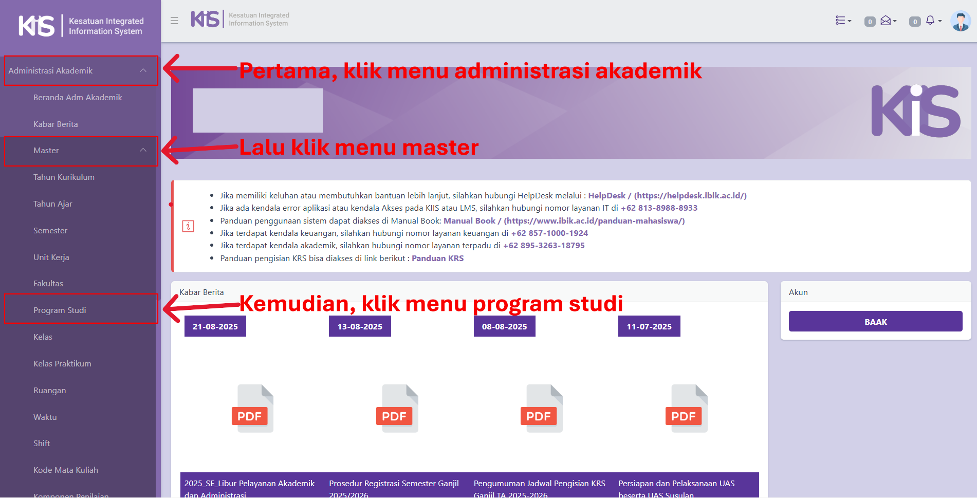 - Pertama, Klik menu Administrasi Akademik lalu pilih submenu Master. Kemudian pilih lagi menu Program Studi.