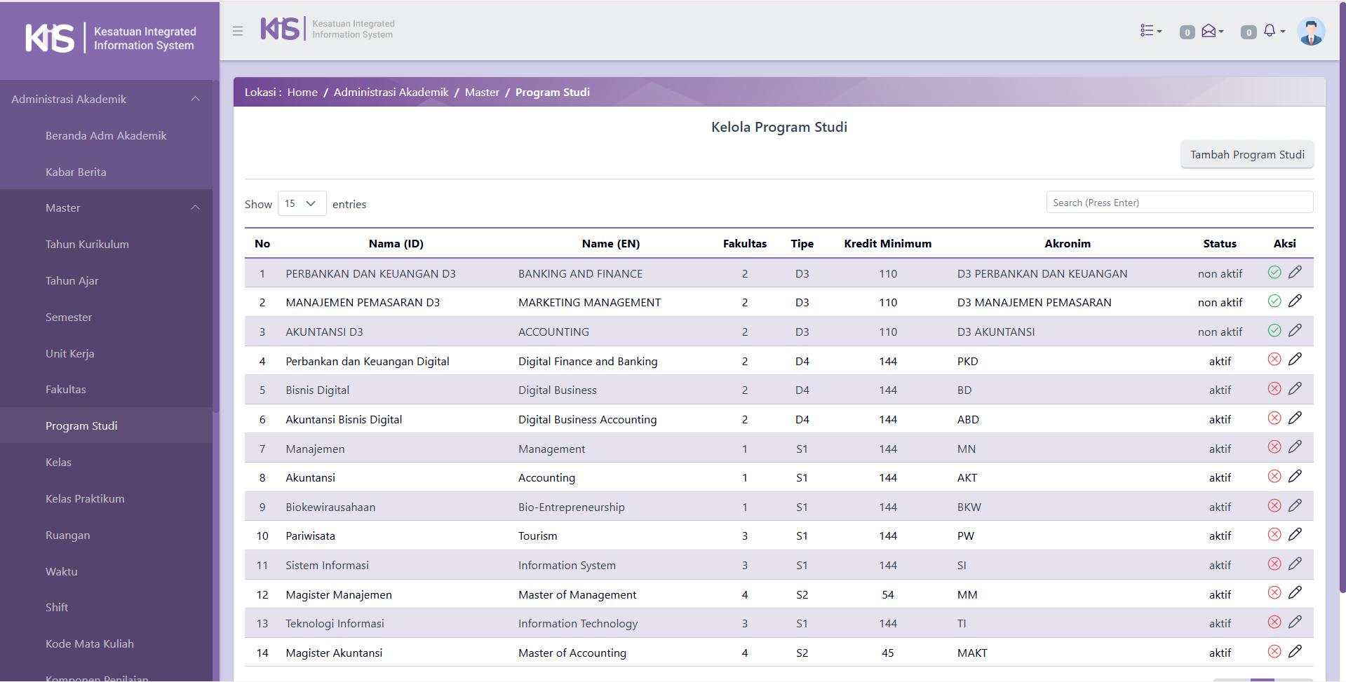Tampilan antarmuka (user interface) ketika BAAK berhasil klik menu Program Studi pada aplikasi KIIS.