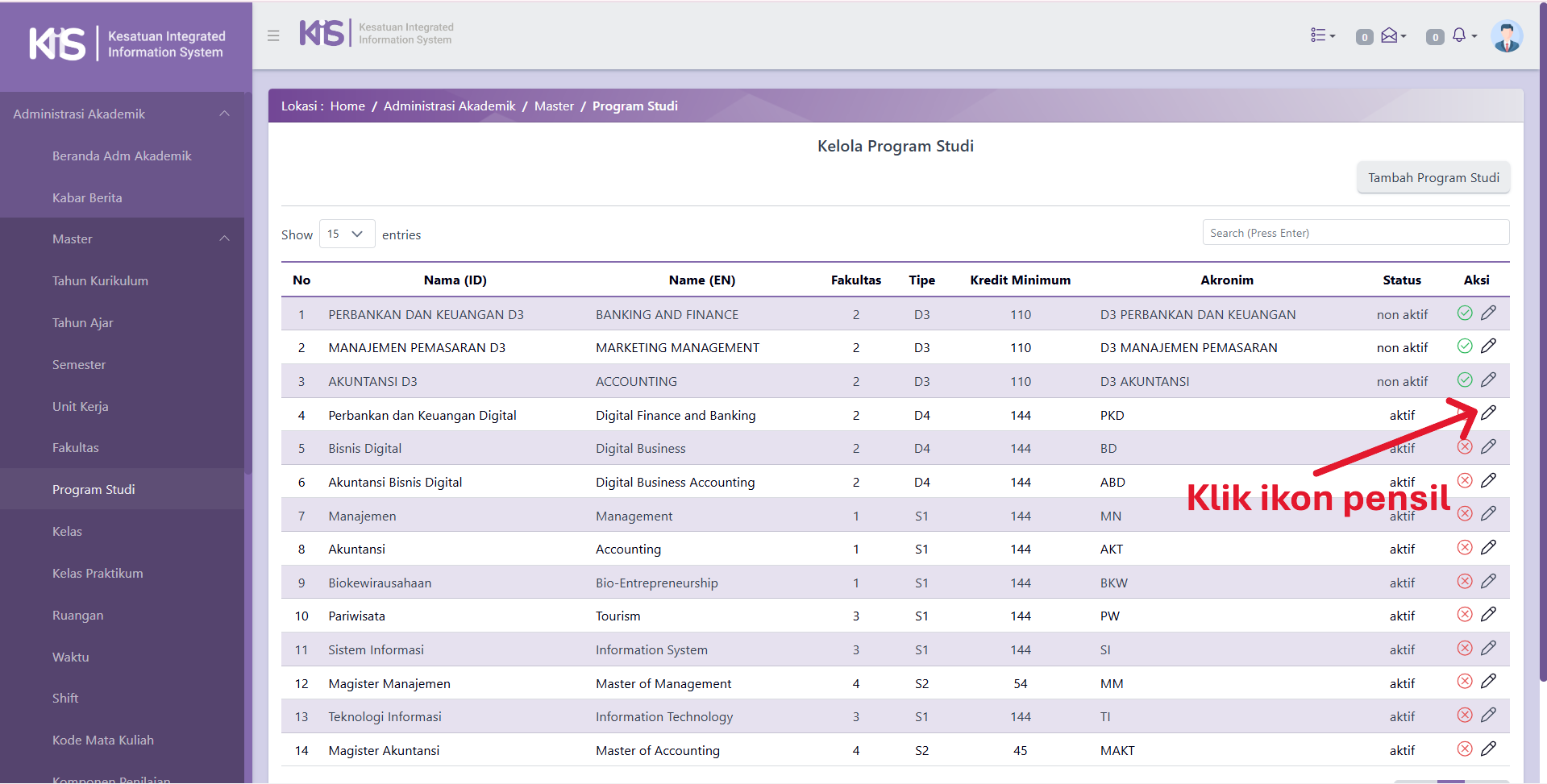 Pertama, klik ikon pensil untuk memeriksa apakah data Program Studi sudah sesuai dengan standar akademik atau belum.