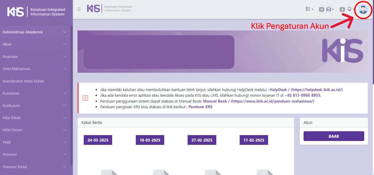 - Tampilan antarmuka (user interface) ketika BAAK berhasil LOGIN pada aplikasi KIIS adalah sebagai berikut:
