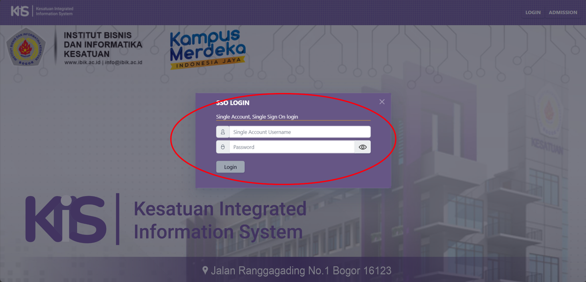 Gambar diatas adalah halaman tampilan awal ketika BAAK berhasil mengakses aplikasi KIIS. Pada tampilan awal ini, terdapat beberapa Menu yang dapat BAAK akses yaitu Menu LOGIN dan Menu ADMISSION. Silahkan BAAK klik Menu LOGIN.