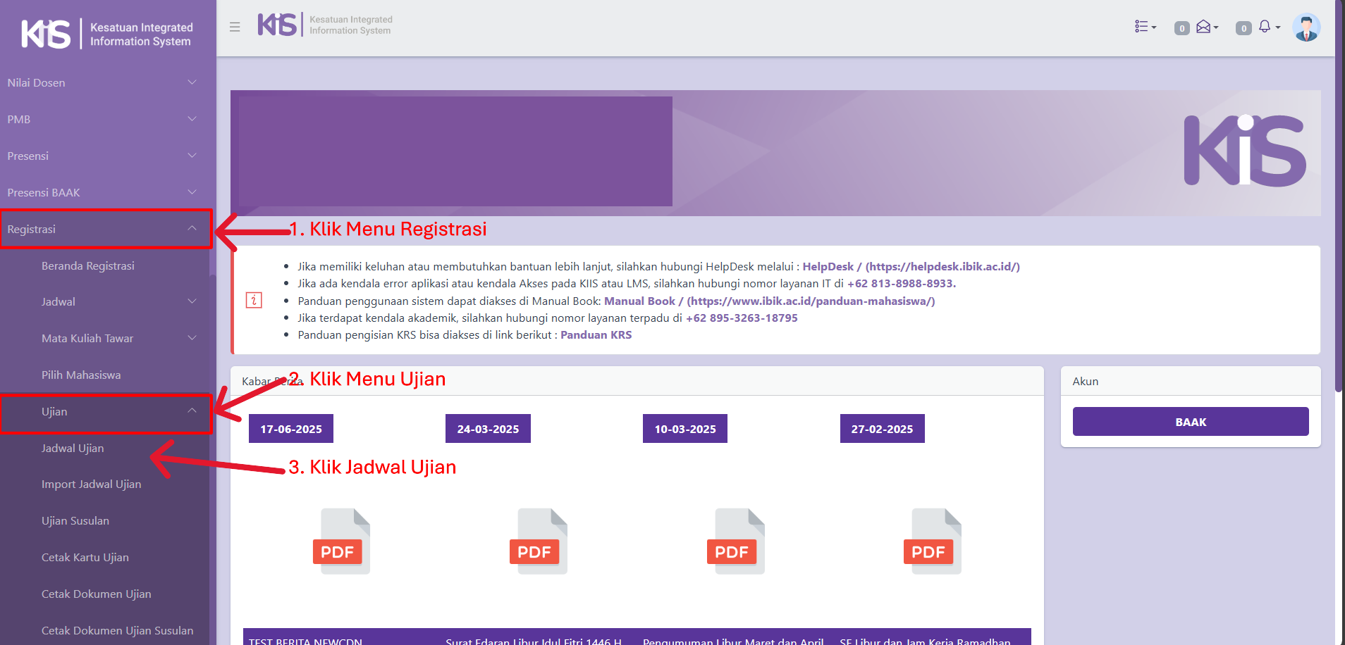 Pertama, BAAK Klik Menu Registrasi, Setelahnya Klik Ujian, Lalu Klik Jadwal Ujian.
