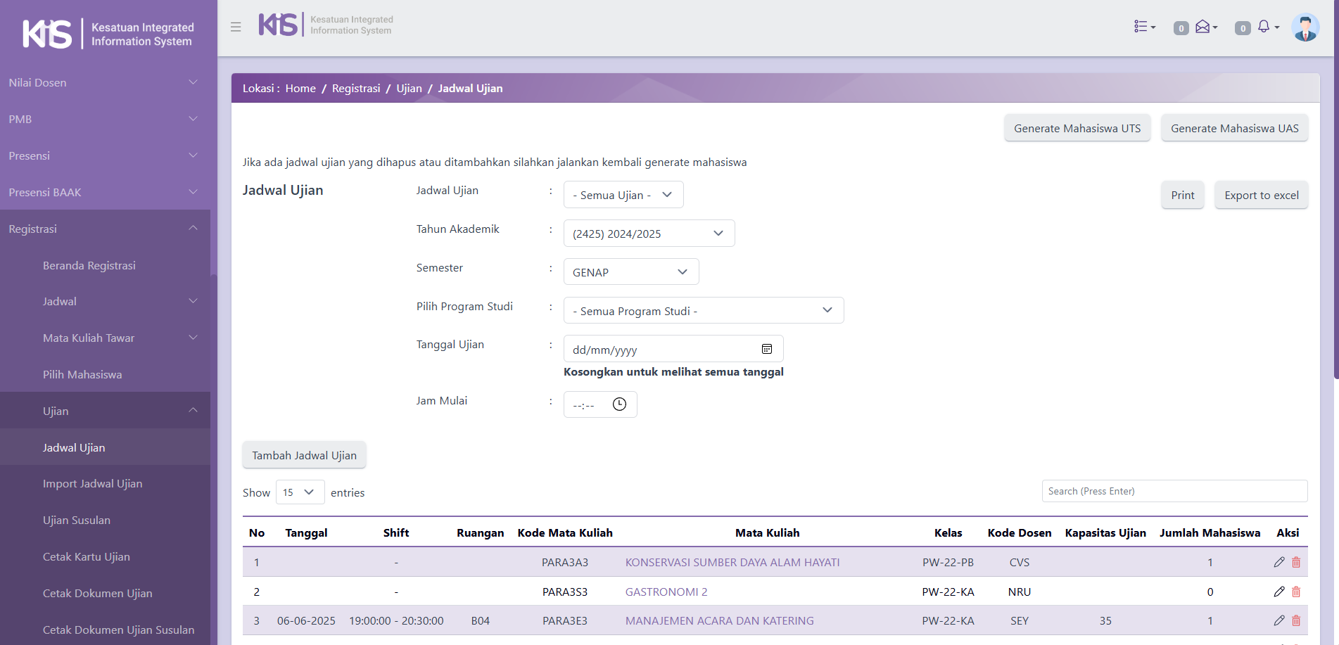 - Setelah BAAK Klik Menu Ujian, Setelahnya Klik Jadwal Ujian, tampilan halaman yang akan muncul adalah sebagai berikut: