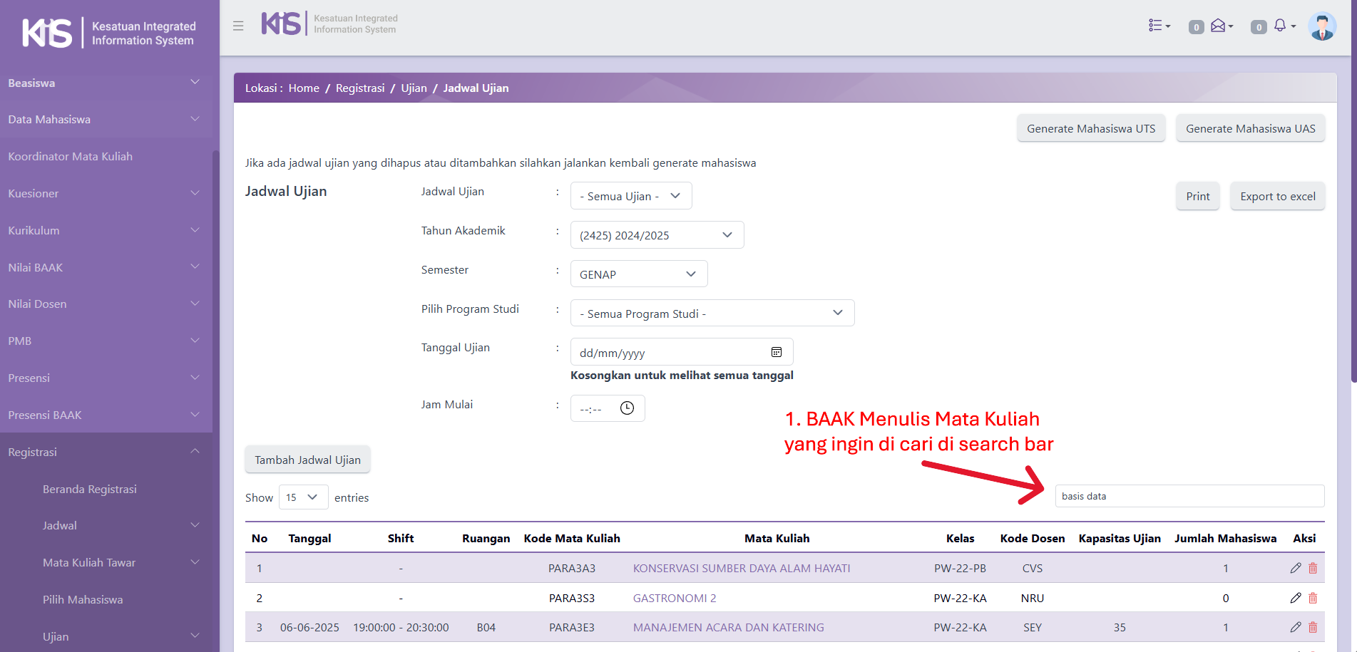 - Pertama, Baak Mencari Mata Kuliah yang ingin diganti pengawas ujian-nya dengan cara menulis Mata Kuliah yang akan dicari Disearch Bar yang sudah tersedia.