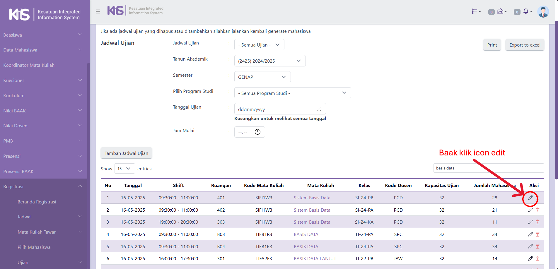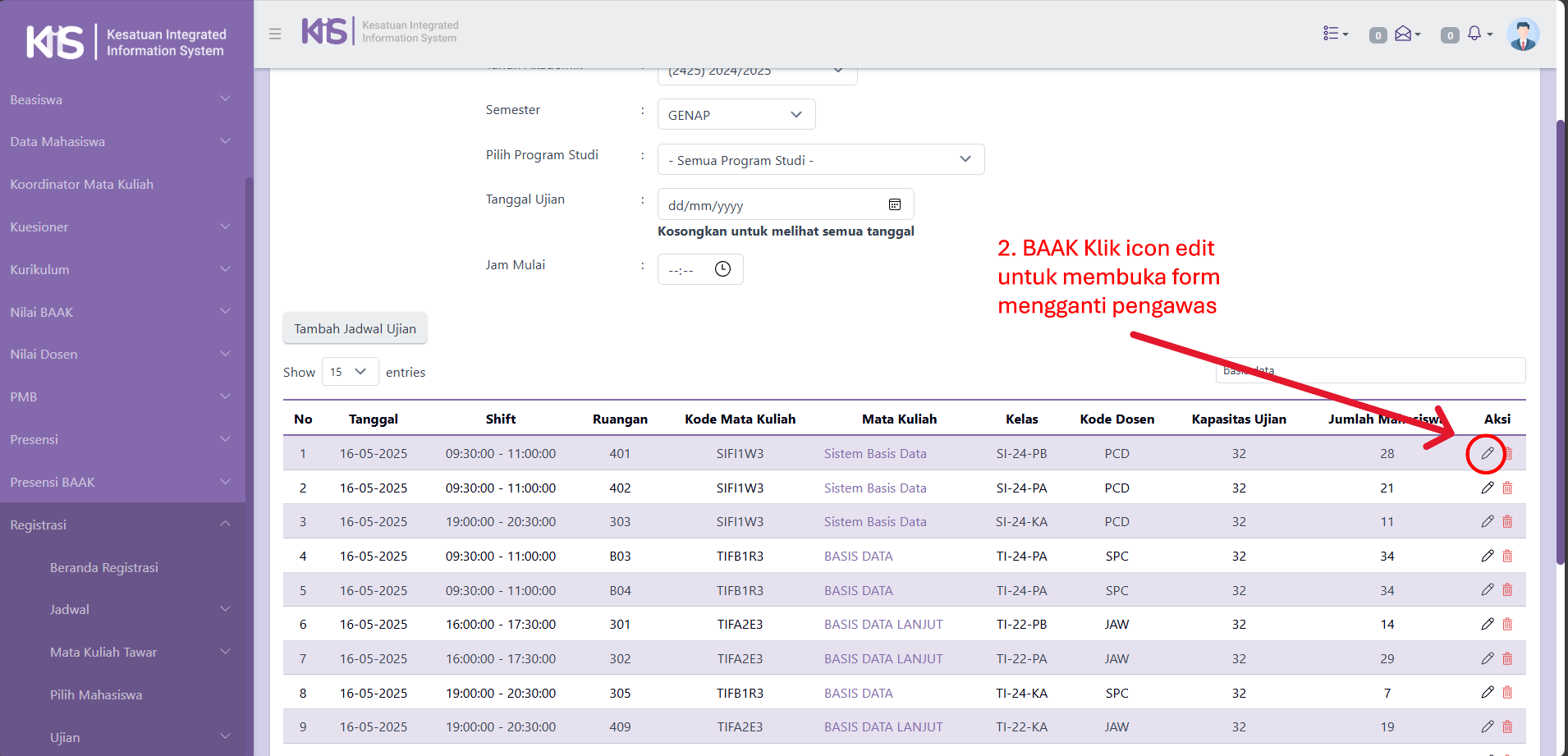 - Kedua, Baak Klik Icon Edit pada Mata Kuliah yang ingin di ganti Pengawas Ujian-nya.