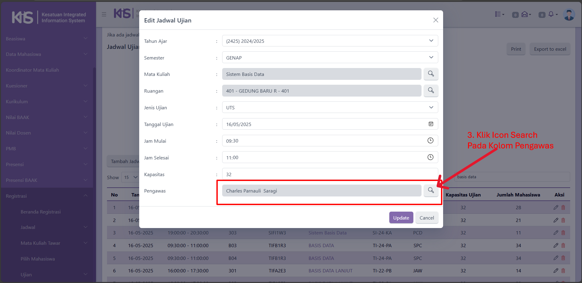 - Ketiga, Baak Klik Icon Search pada kolom pengawas untuk mencari nama pengawas ujian yang baru.