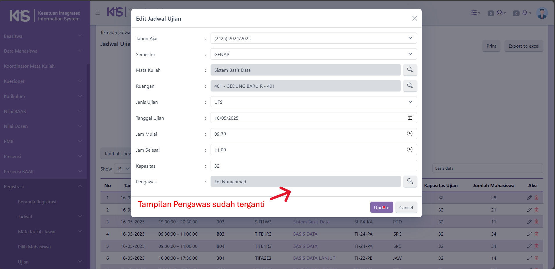 - Tampilan setelah Baak mengganti pengawas ujian.