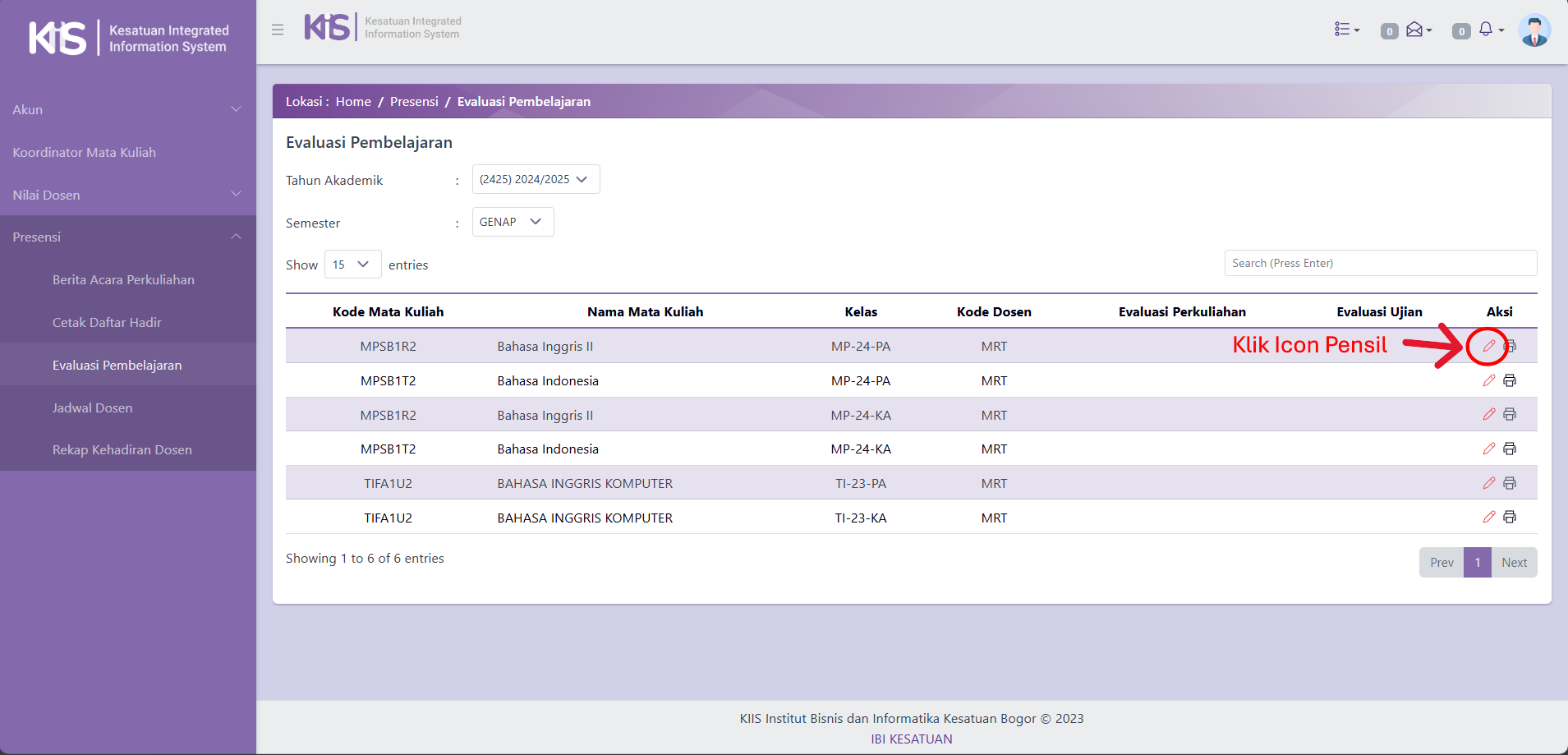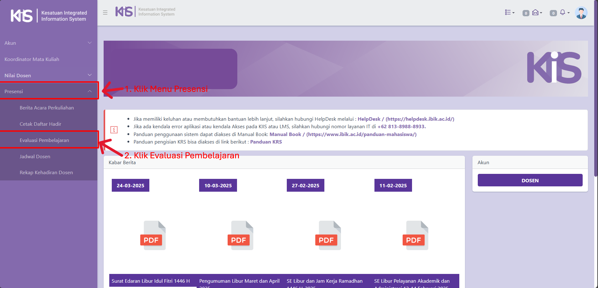 - Pertama, Dosen klik Menu Presensi, Lalu Kedua Dosen klik Evaluasi Pembelajaran: