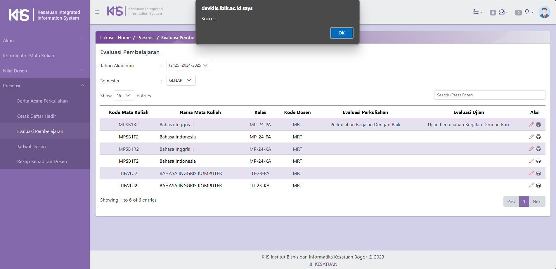 - Tampilan Setelah Berhasil Mengisi Form Evaluasi Perkuliahan dan Evaluasi Pembelajaran.