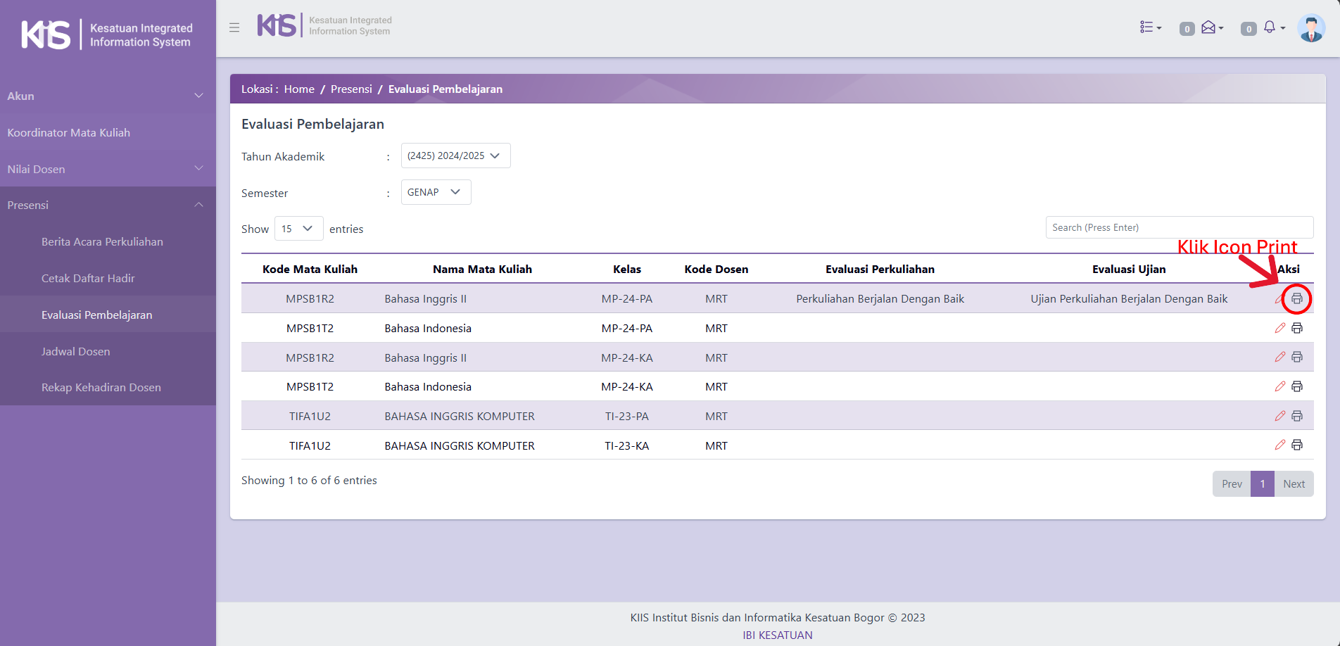 - Keempat, Klik Icon Print untuk Mencetak Dokumen Hasil Evaluasi Pembelajaran.