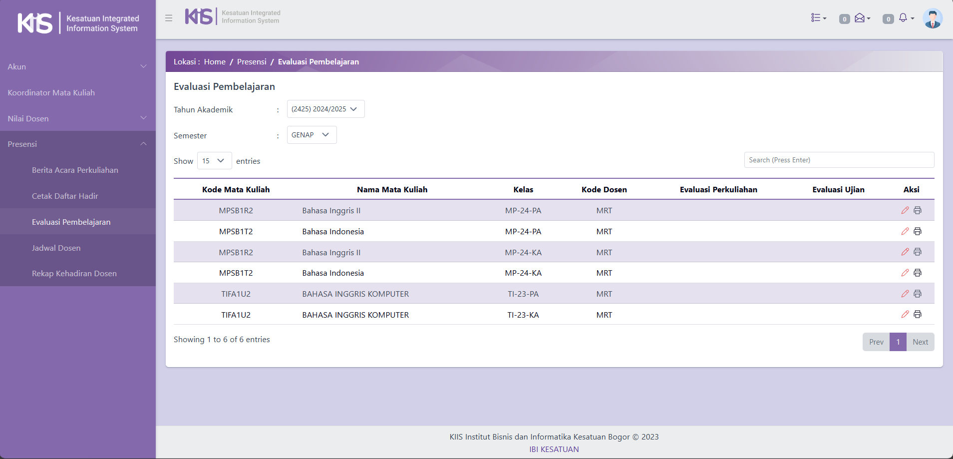 - Setelah Dosen berhasil LOGIN di sistem KIIS, Dosen dapat langsung Melakukan Submit Evaluasi Pembelajaran pada Menu Evaluasi Pembelajaran. Rincian tata cara Mensubmit Evaluasi Pembelajaran adalah sebagai berikut: