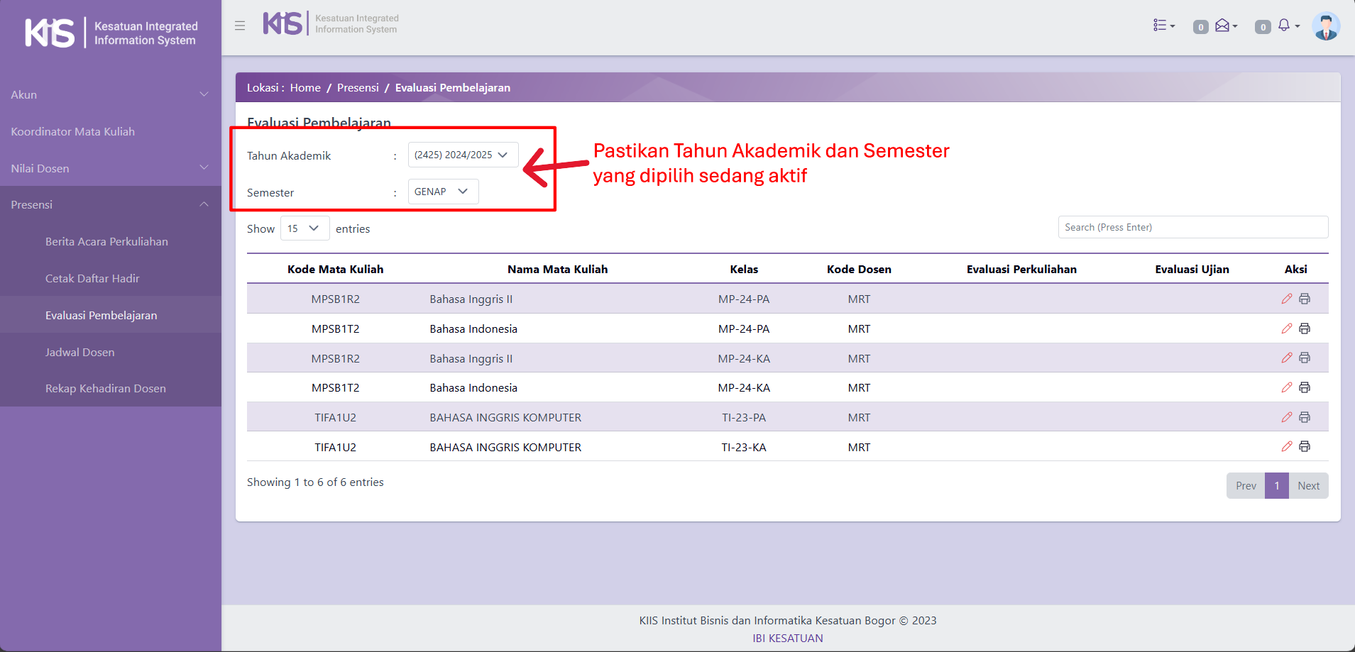 - Pertama, Pastikan Tahun Akademik dan Semester yang dipilih sedang aktif.
