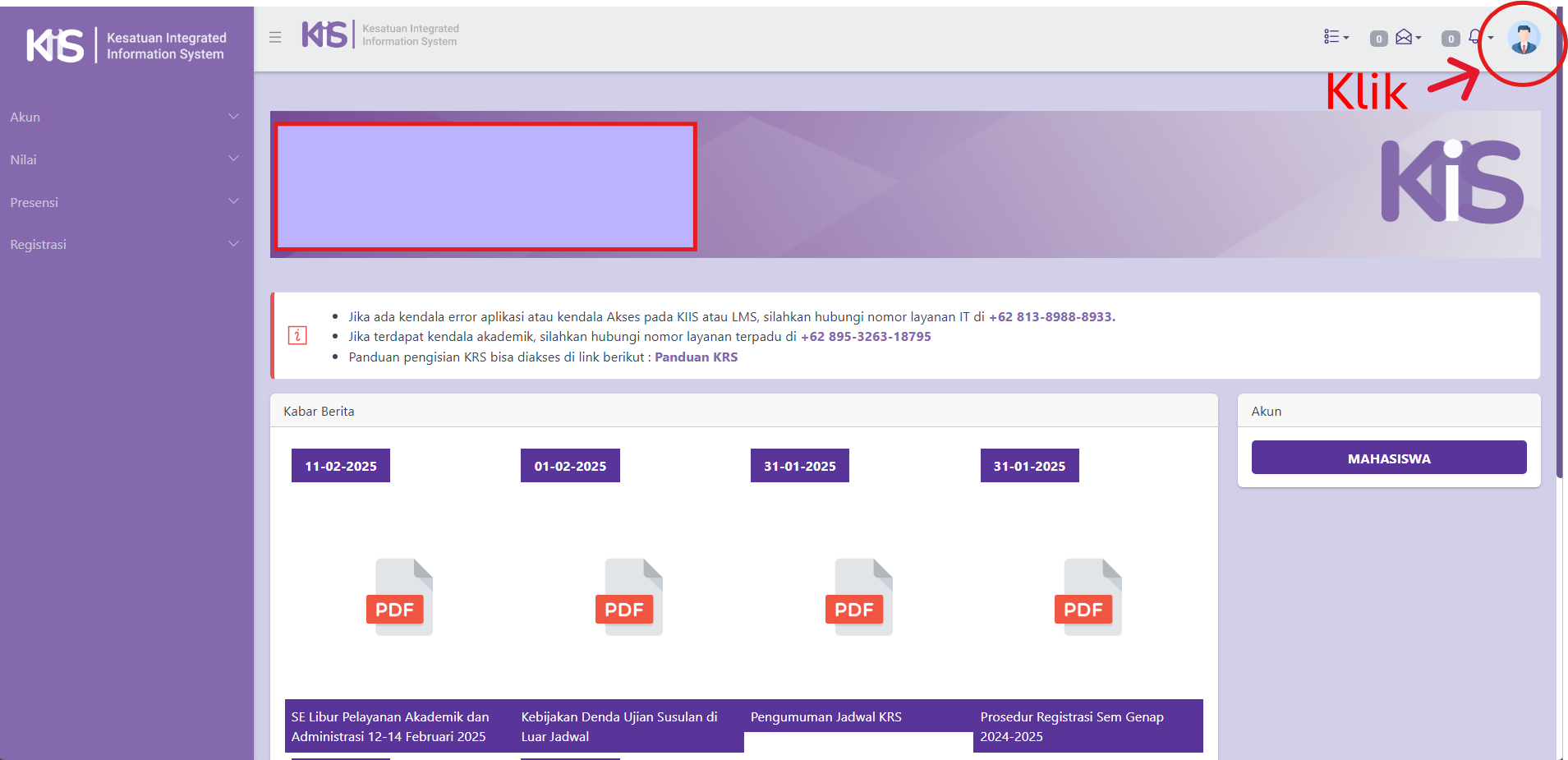 PENTING DIINGAT !!! setelah berhasil Login, Mahasiswa WAJIB mengganti Password default dengan Password baru untuk keamanan akun Mahasiswa.