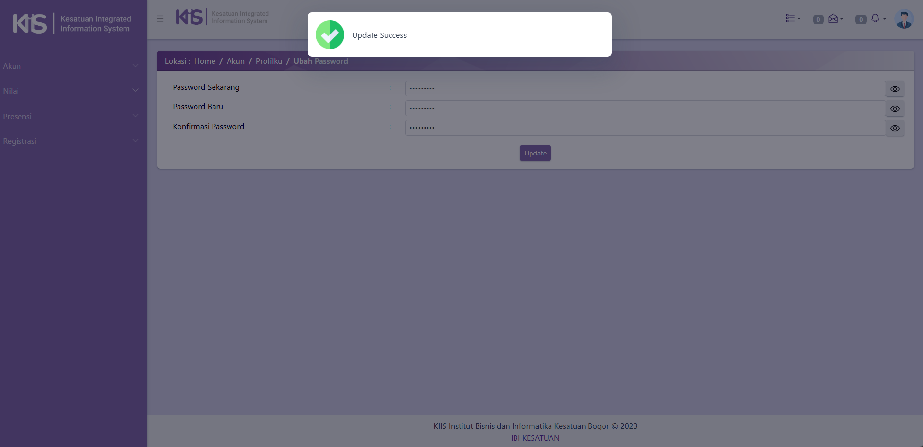 - Tampilan antarmuka (user interface) ketika Mahasiswa berhasil mengganti Password pada aplikasi KIIS adalah sebagai berikut: