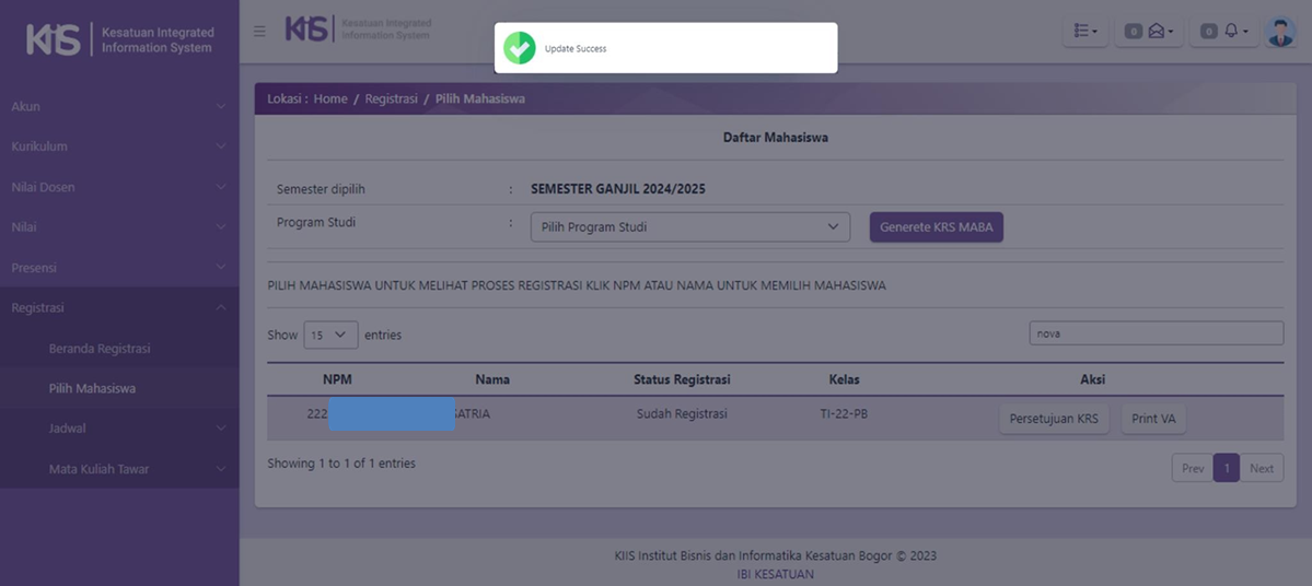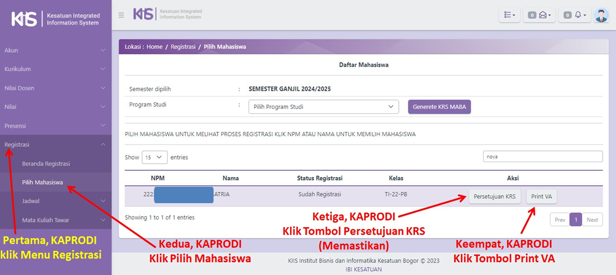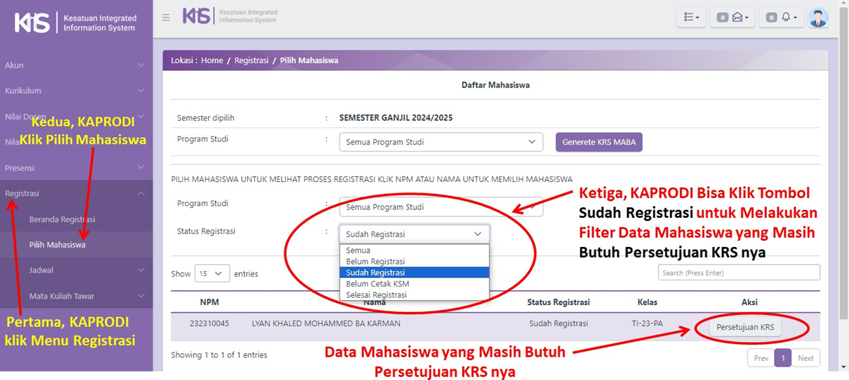 Setelah KAPRODI berhasil login, KAPRODI dapat langsung melakukan approve Kartu Rencana Studi (KRS) Mahasiswa pada menu Registrasi.