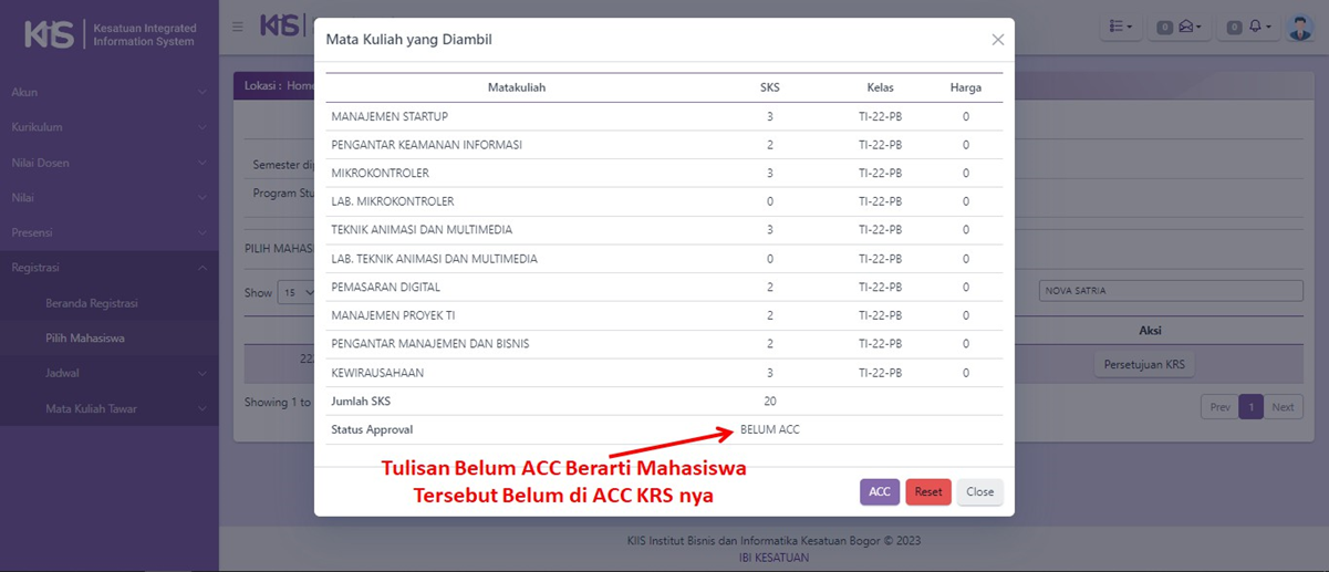 Setelah KAPRODI memeriksa daftar mata kuliah yang Mahasiswa ajukan, namun ternyata KAPRODI perlu melakukan reset atas pilihan mata kuliah ajuan Mahasiswa tersebut, maka KAPRODI dapat klik tombol Reset.