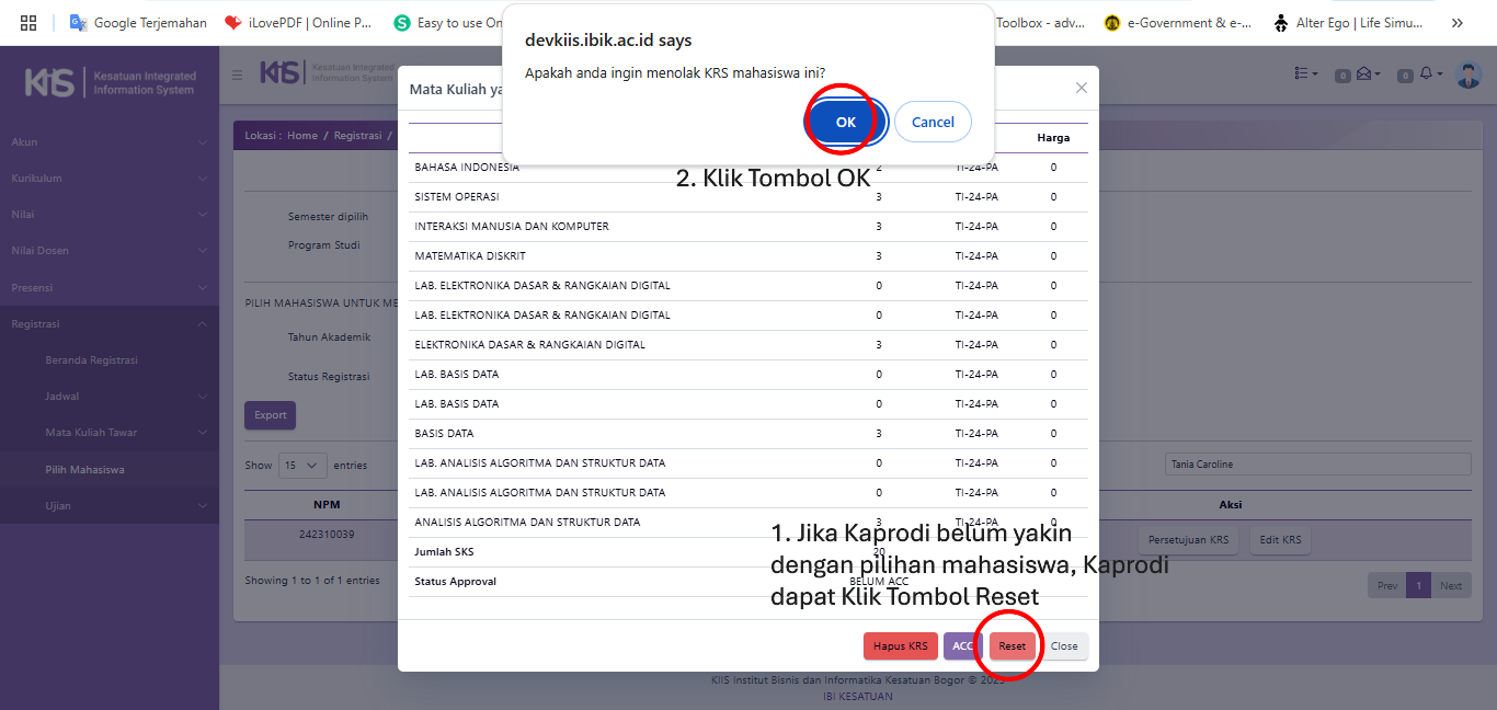 Cara dan Tampilan JIka KAPRODI Klik Tombol Reset pada Ajuan Mata Kuliah