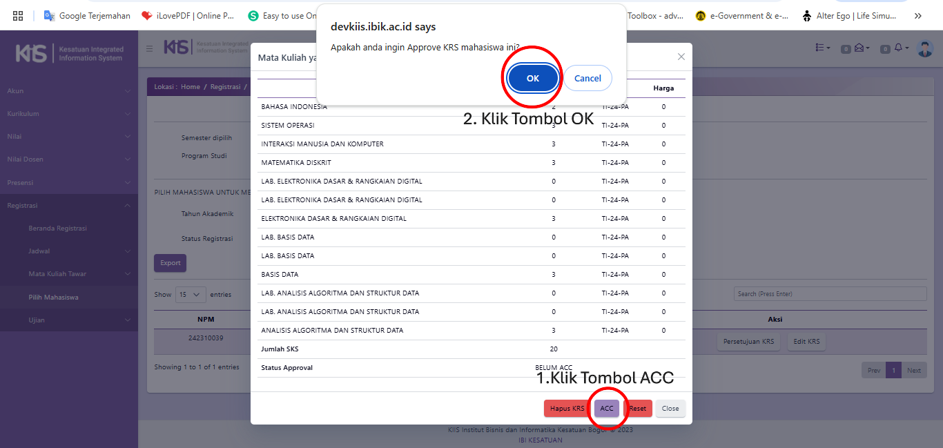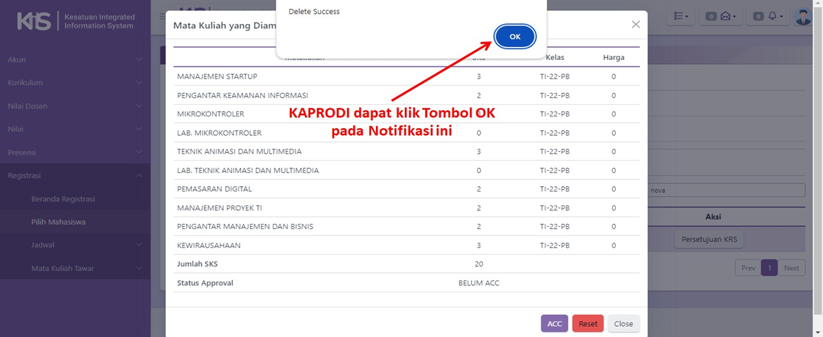 - Jika KAPRODI telah menyetujui mata kuliah yang diajukan oleh Mahasiswa, maka KAPRODI dapat klik tombol ACC dan tombol OK seperti tata cara di bawah berikut ini