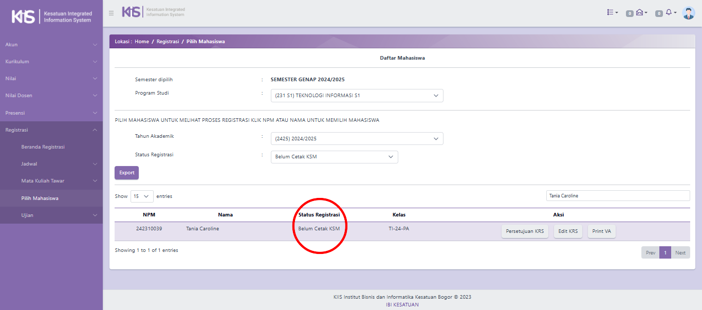 - Jika KAPRODI telah menyetujui mata kuliah yang diajukan oleh Mahasiswa, maka KAPRODI dapat memastikan kembali status Mahasiswa tersebut dengan tata cara di bawah berikut ini: