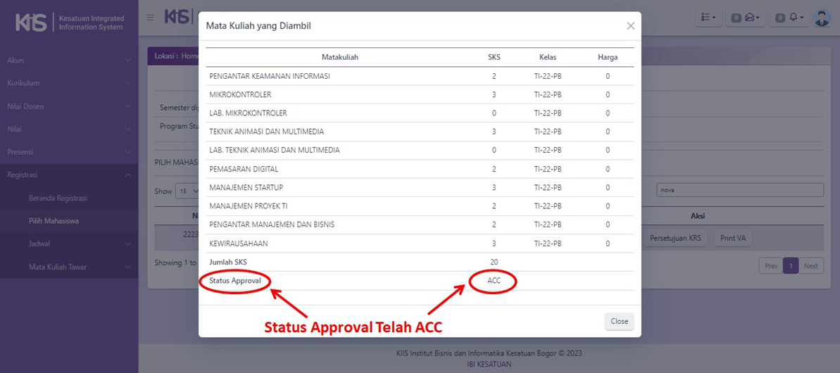 - Dibawah ini adalah tampilan setelah KAPRODI klik tombol ACC dan tombol OK pada ajuan mata kuliah Mahasiswa: