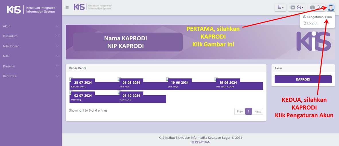 PENTING DIINGAT !!! setelah berhasil LOGIN, KAPRODI WAJIB mengganti Password default dengan Password baru untuk keamanan akun KAPRODI.