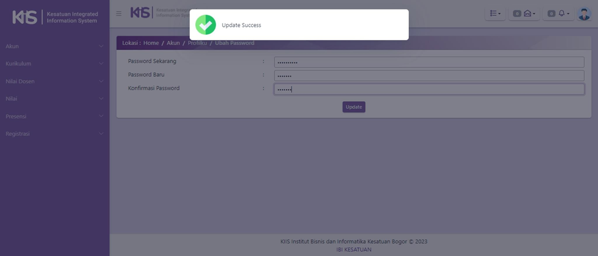 - Tampilan antarmuka (user interface) ketika KAPRODI berhasil mengganti Password pada aplikasi KIIS adalah sebagai berikut:
