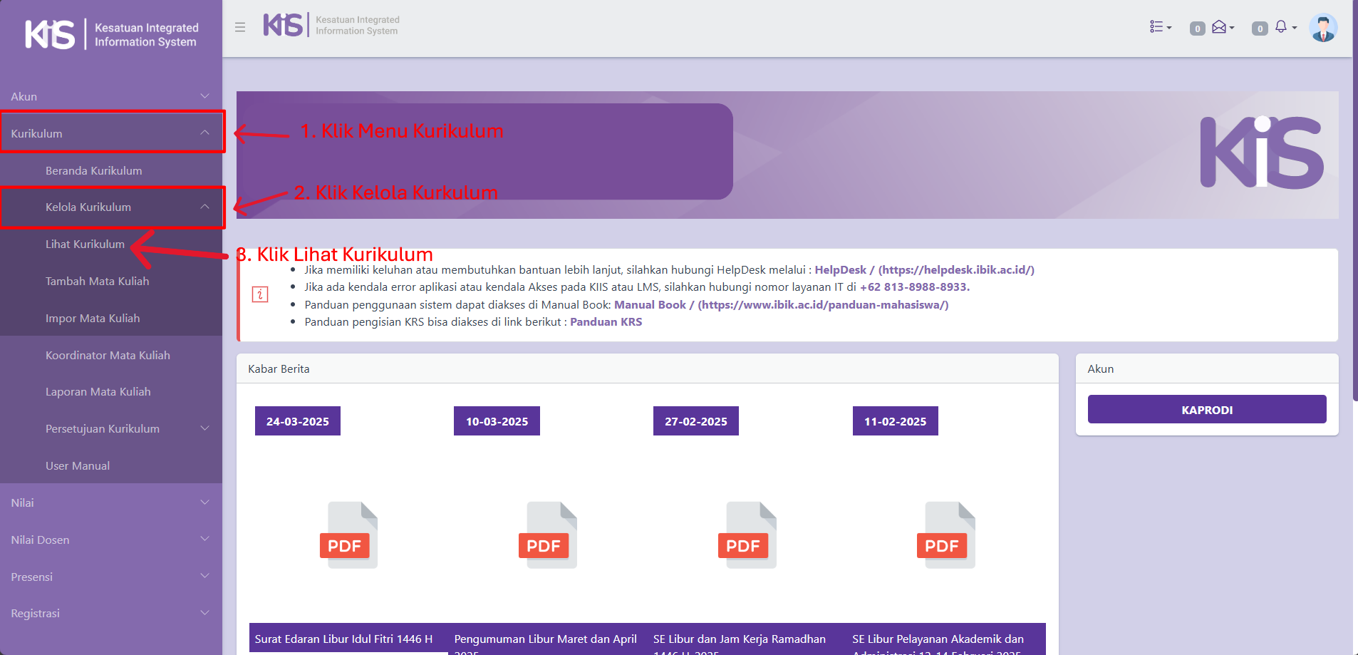 Setelah berhasil LOGIN di sistem KIIS, Kaprodi dapat langsung Mengelola Kurikulum pada Menu Kelola Kurikulum. Rincian tata cara Mengelola Kurikulum adalah sebagai berikut: