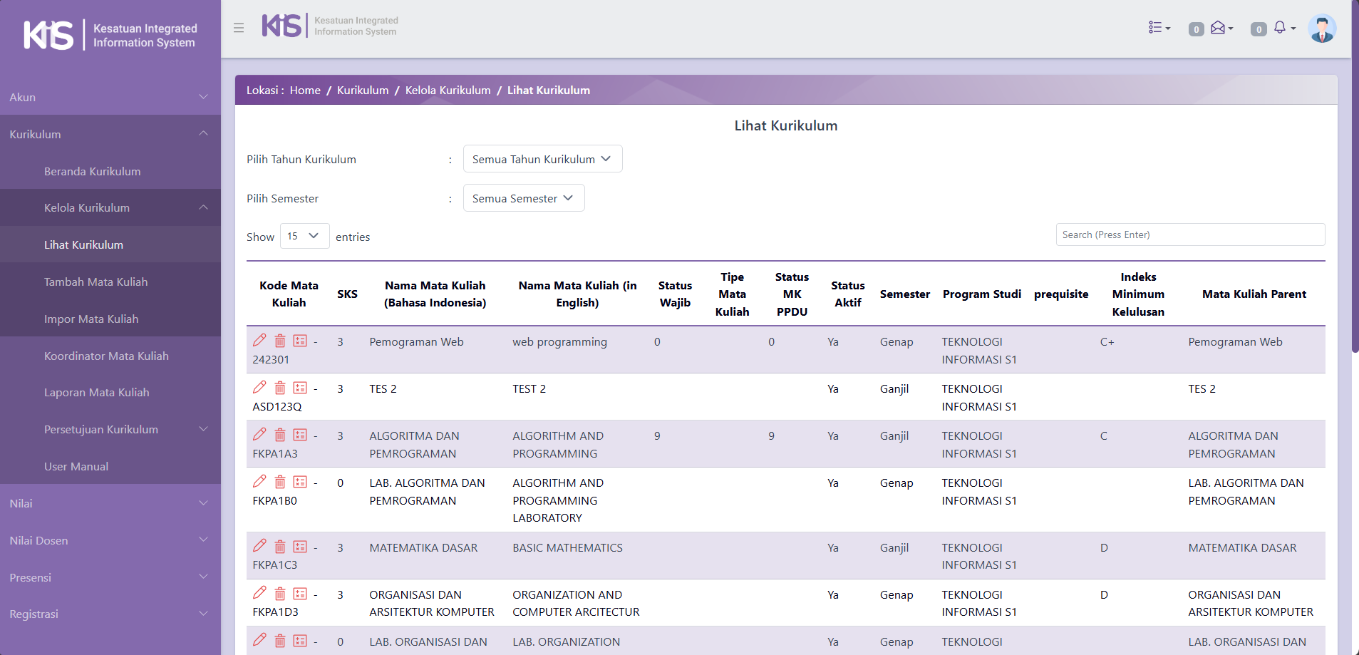 Setelah Kaprodi klik Kelola Kurikulum dan Klik Lihat Kurikulum, tampilan halaman yang akan muncul adalah sebagai berikut: