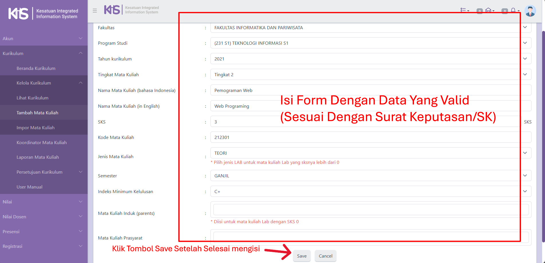 Kedua, Kaprodi Isi Form Dengan Data Yang Valid (Sesuai Dengan Surat Keputasan/SK),Lalu Sesudah mengisi form Klik Tombol Save.
