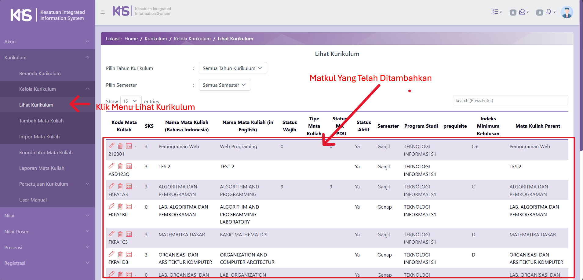 Ketiga, Kaprodi Klik Kembali Menu Lihat Kurikulum Untuk Melihat Mata Kuliah Yang telah ditambahkan.