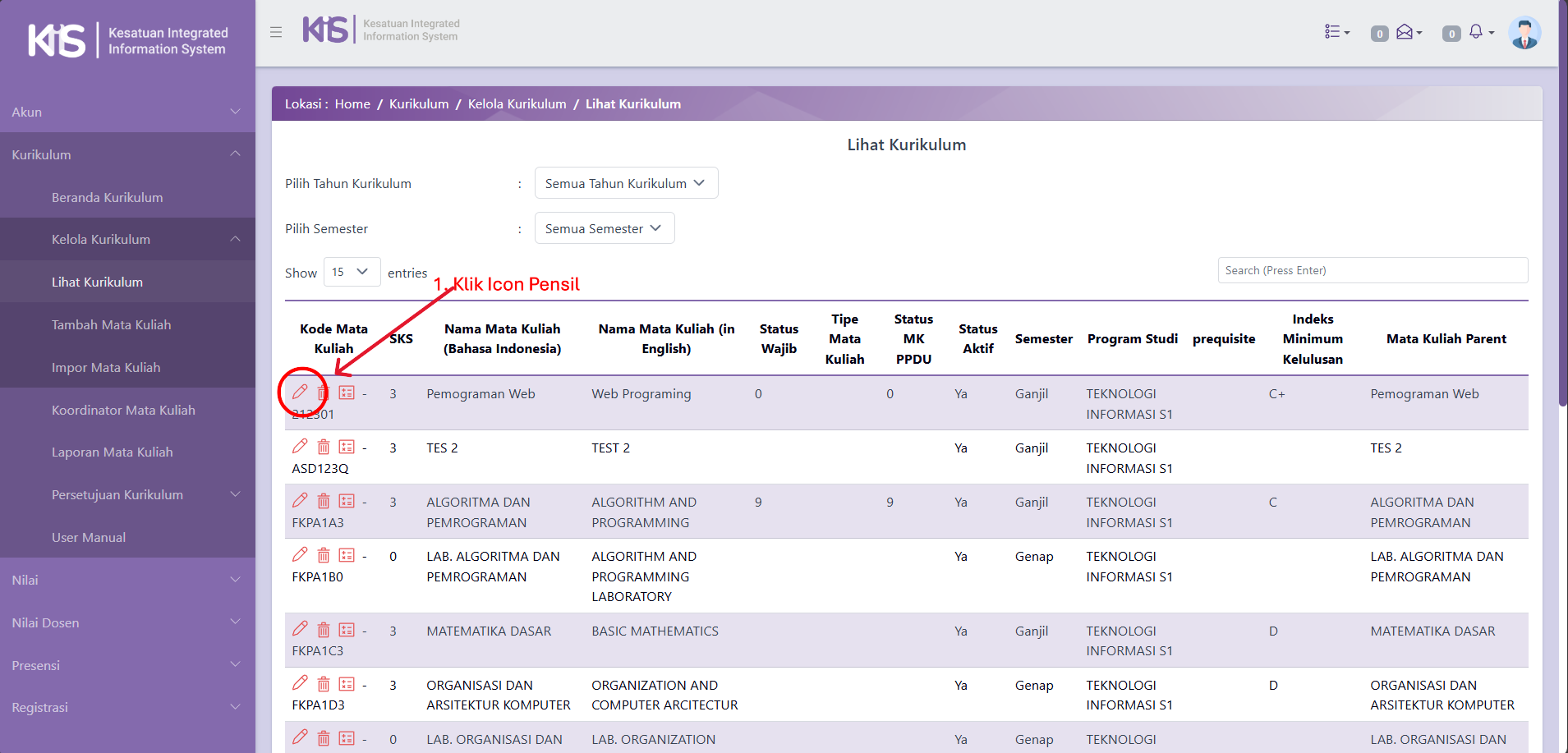 Pertama, Kaprodi Memilih Mata Kuliah yang akan di edit,lalu Klik Icon Pensil.