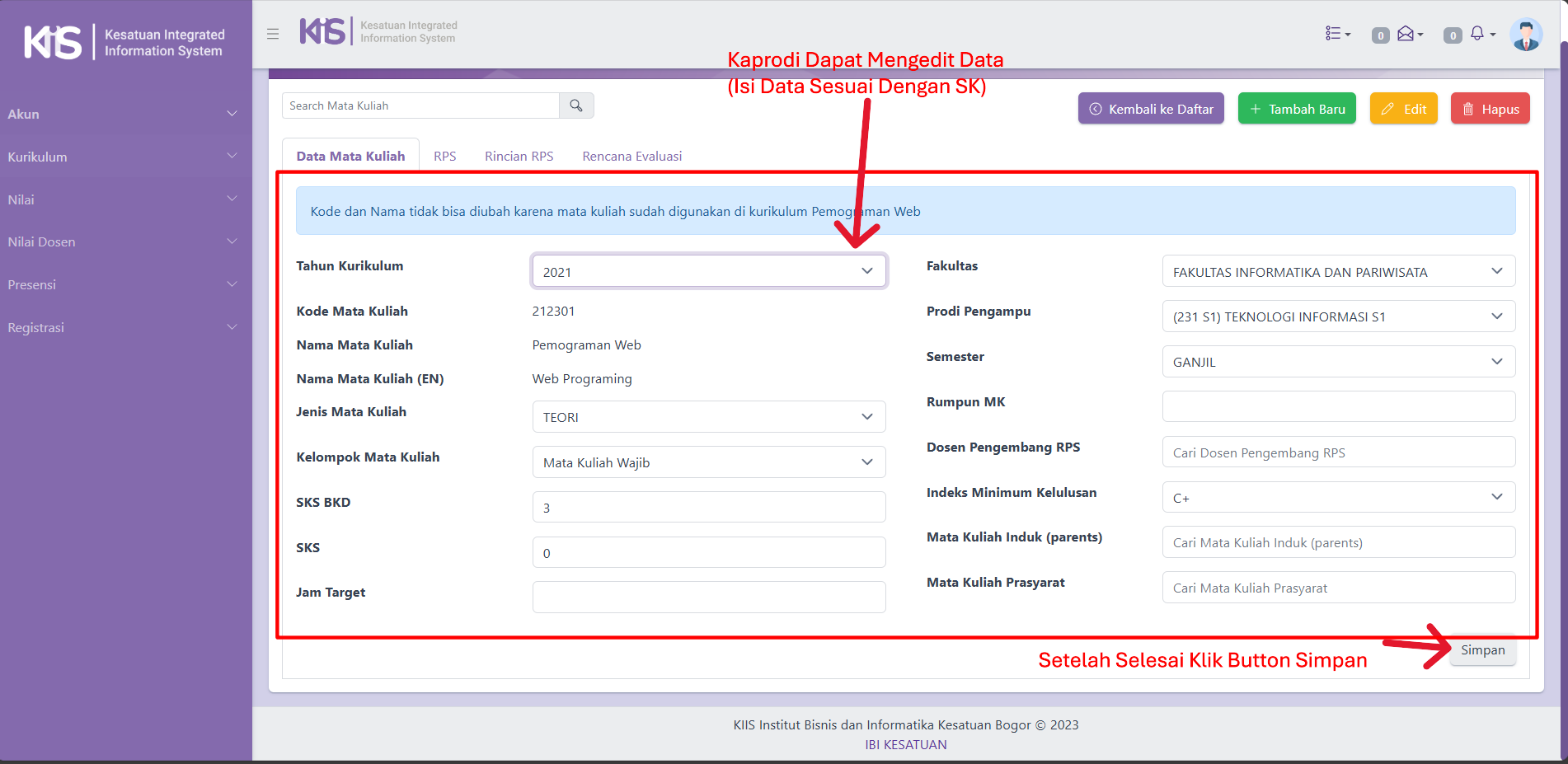 Ketiga, Kaprodi Dapat Mengedit Data-Data Mata Kuliah,Setelah selesai Klik Button Simpan.