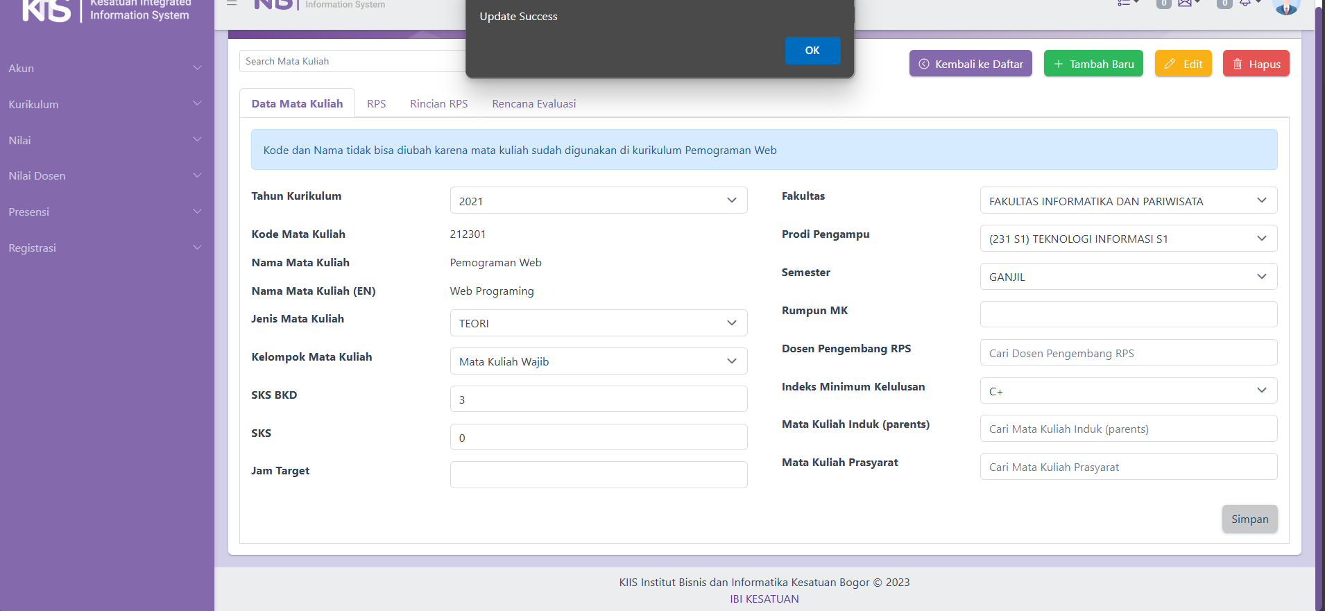 Tampilan Antarmuka Setelah Kaprodi Sukses Mengedit Data Mata Kuliah.