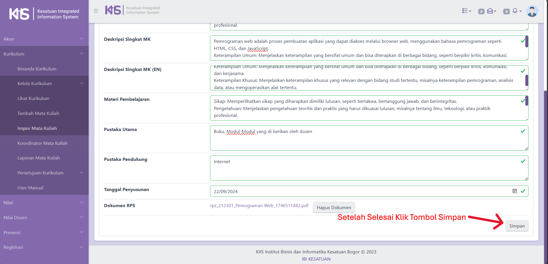 Selesai Mengisi RPS, Kaprodi klik button Simpan.