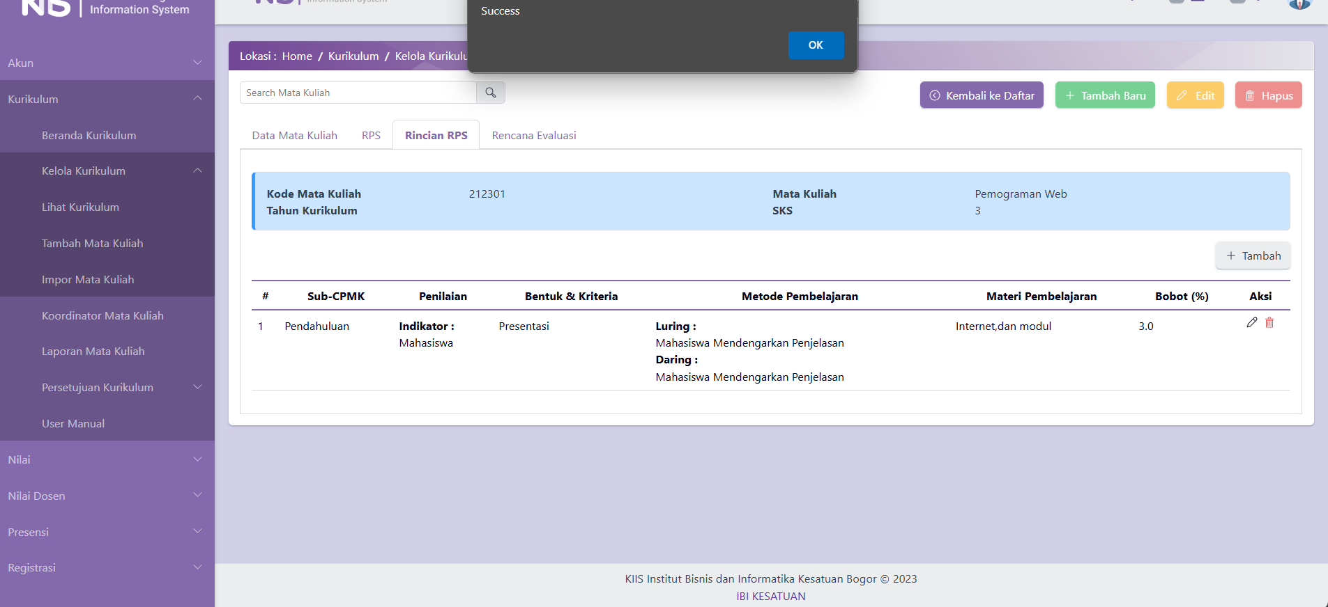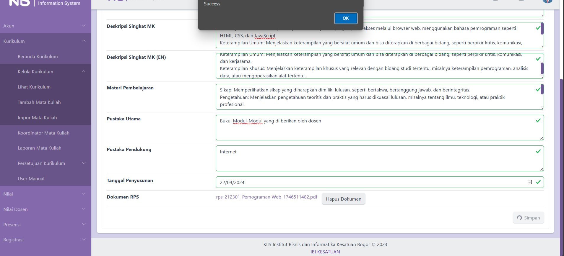 Tampilan Antarmuka Setelah Kapordi Sukses Mengisi Rincian RPS.